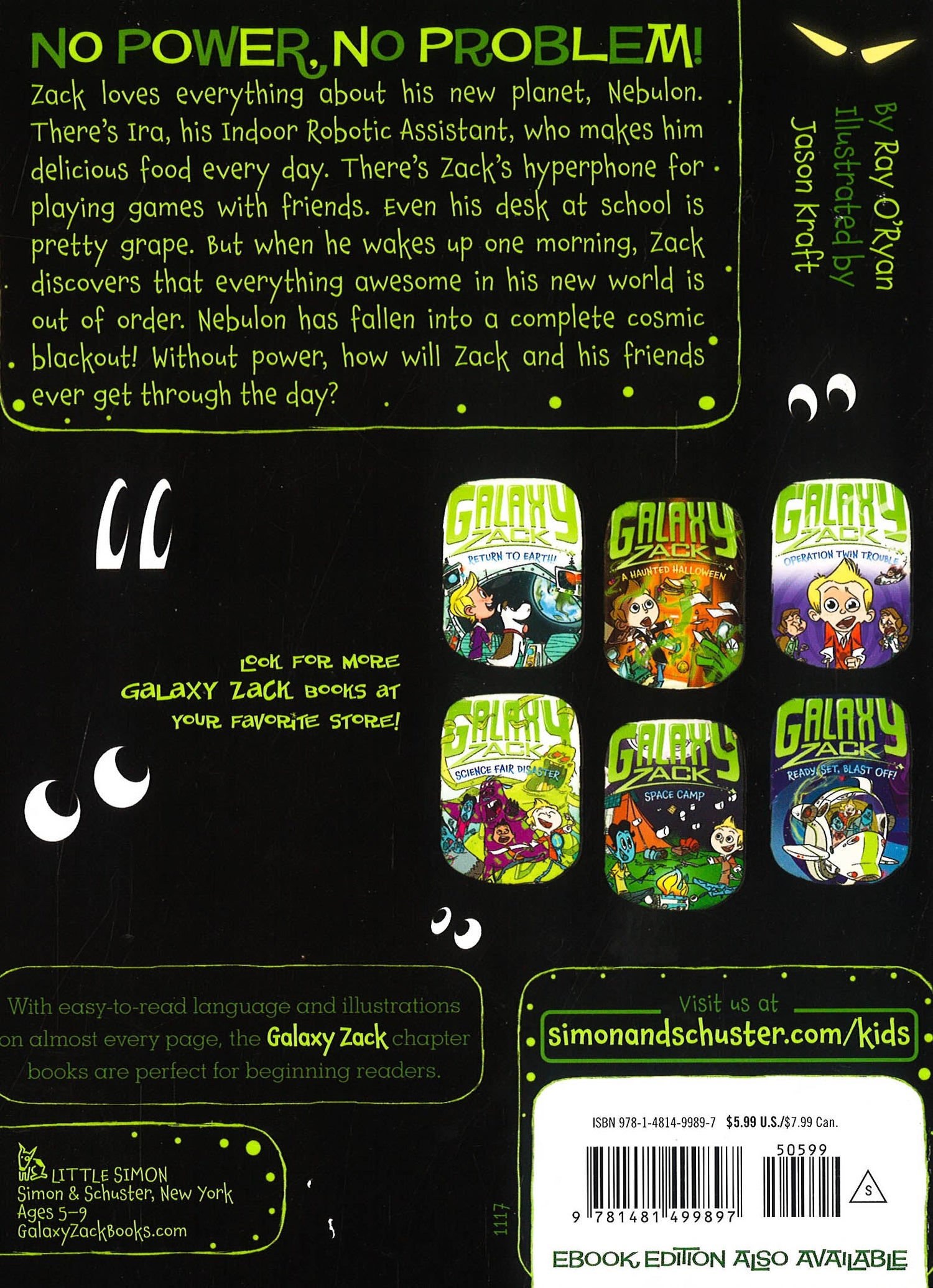 In this sixteenth Galaxy Zack adventure, Nebulon falls into a complete cosmic blackout! Zack loves everything about his new planet, Nebulon. There's Ira, his Indoor Robotic Assistant, who makes him delicious food every day. There's Zack's hyperphone for playing games with friends. Even his desk at school is pretty grape. But Zack wakes up one morning to discover that everything awesome about his new planet is out of order. Nebulon has fallen into a complete cosmic blackout. Without power, how will Zack and his friends ever get through the day? With easy-to-read language and illustrations on almost every page, the Galaxy Zack chapter books are perfect for beginning readers.