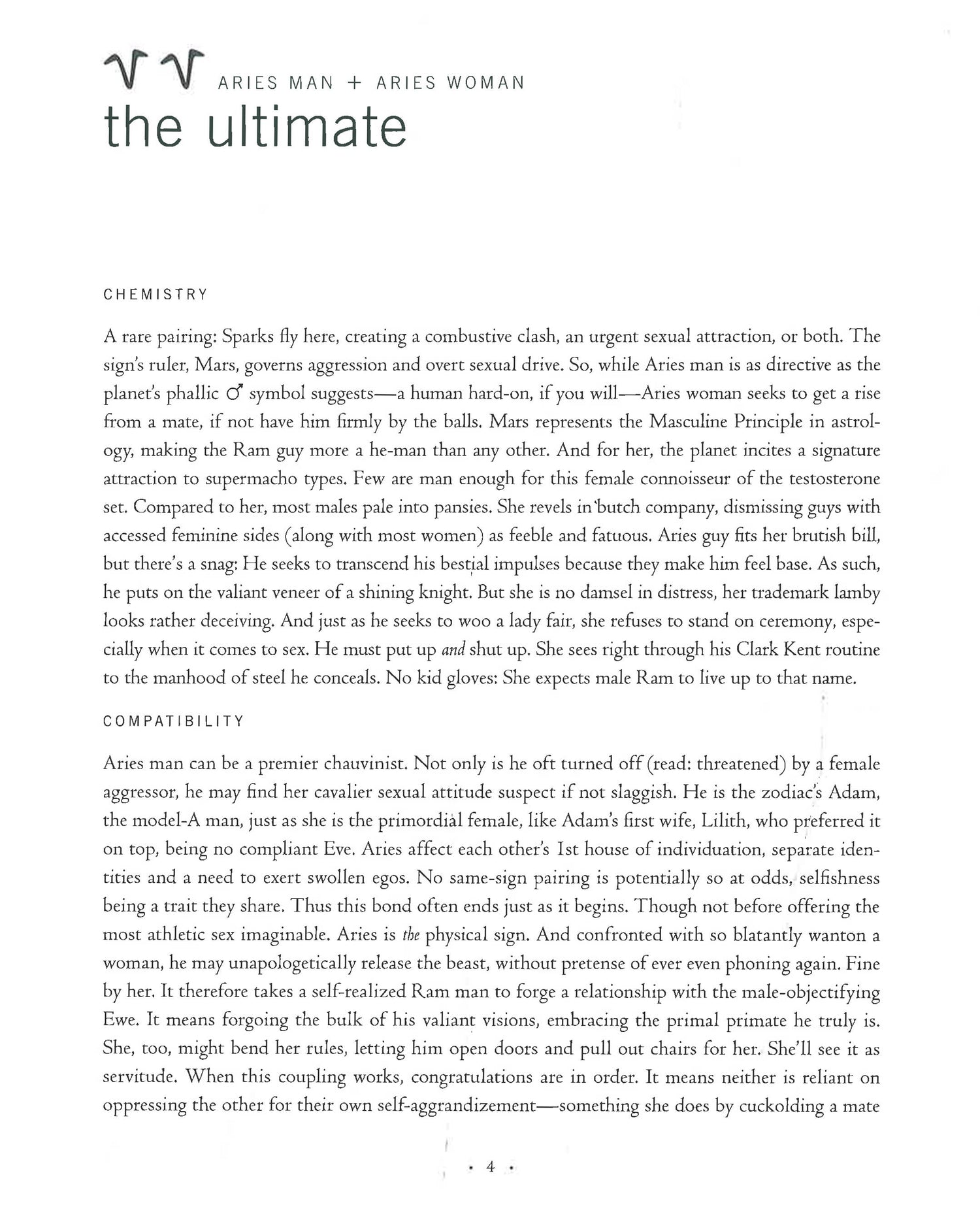 • Compatibility—depicts the relationship needs of each sign and explains how the pair best meshes