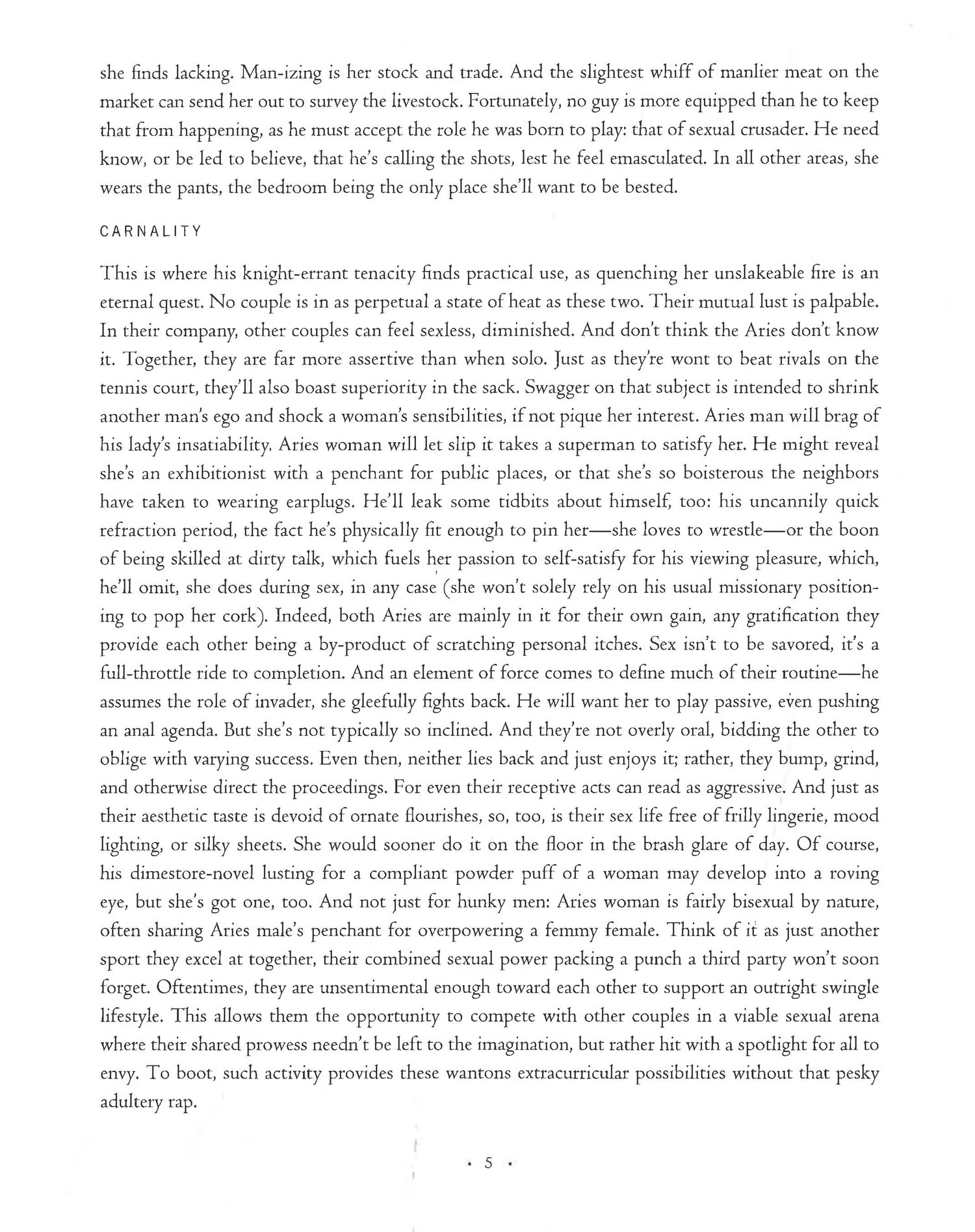• Carnality—details the sexual dynamics of the bond, right on down to the nitty-gritty