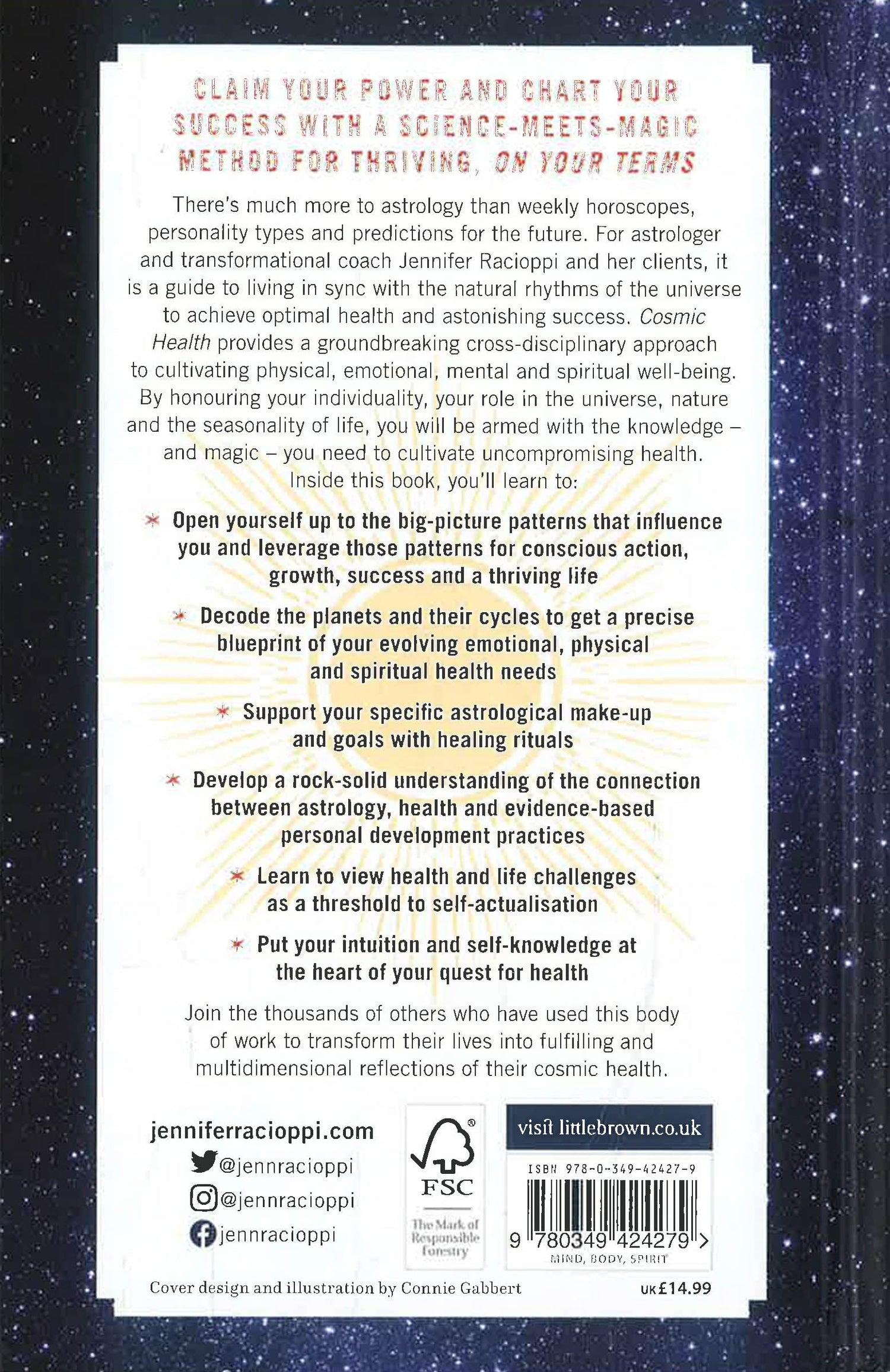 There's much more to astrology than weekly horoscopes, personality types, and predictions for the future. For astrologer and transformational coach Jennifer Racioppi and her clients, it is a guide to living in sync with the natural rhythms of the universe to achieve optimal health and astonishing success. Cosmic Health provides a groundbreaking cross-disciplinary approach to cultivating physical, emotional, mental, and spiritual well-being. By honoring your individuality, your role in the universe, nature, and the seasonality of life, you will be armed with the knowledge-and magic-you need to cultivate uncompromising health.