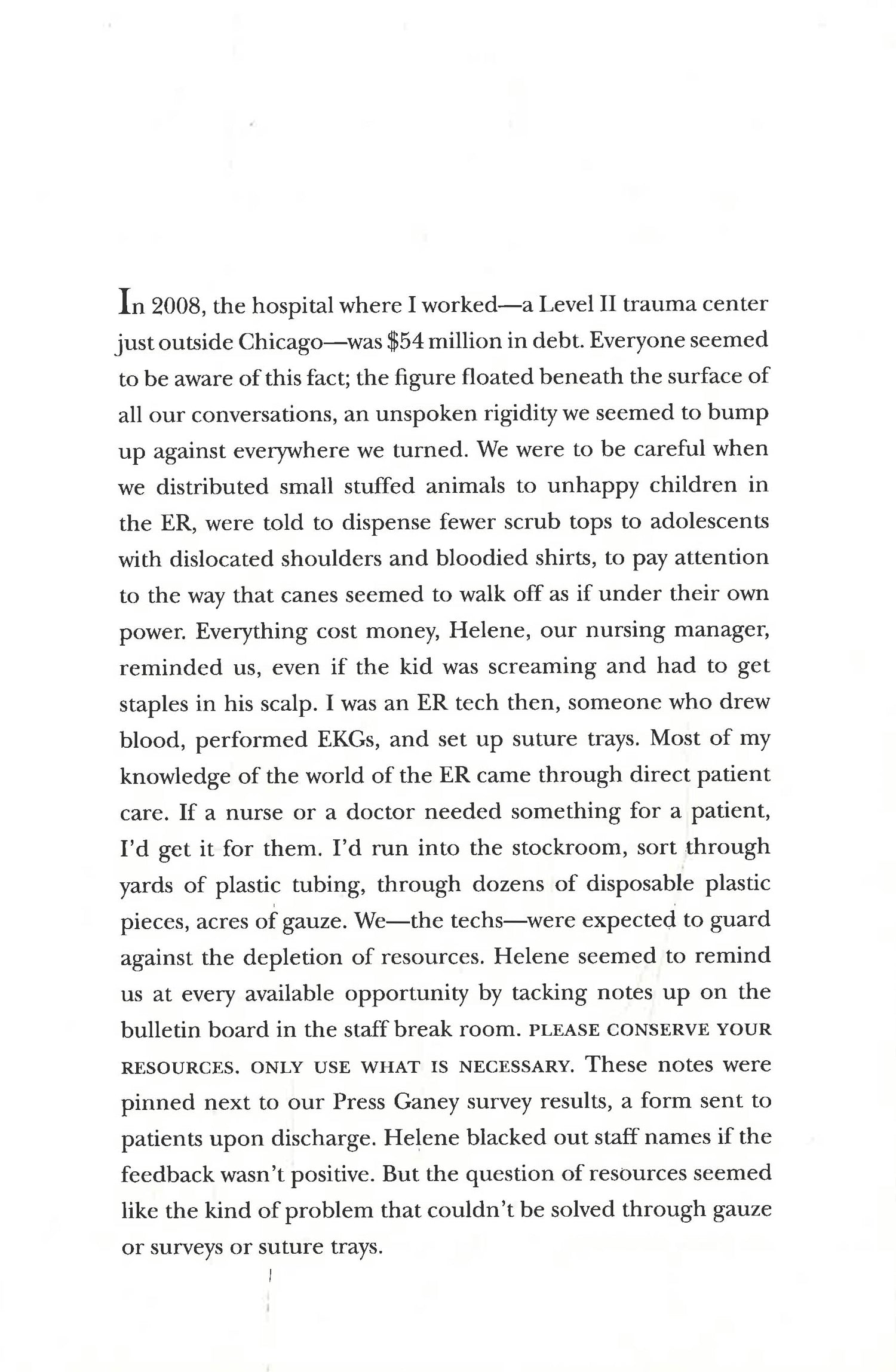 When Emily Maloney was nineteen she tried to kill herself. An act that would not only cost a great deal personally, but also financially, sending her down a dark spiral of misdiagnoses, years spent in and out of hospitals and doctor’s offices, and tens of thousands owed in medical debt. To work to pay off this crippling burden, Emily becomes an emergency room technician. Doing the grunt work in a hospital, and taking care of patients at their most vulnerable moments, chronicling these interactions in searingly beautiful, surprising ways.