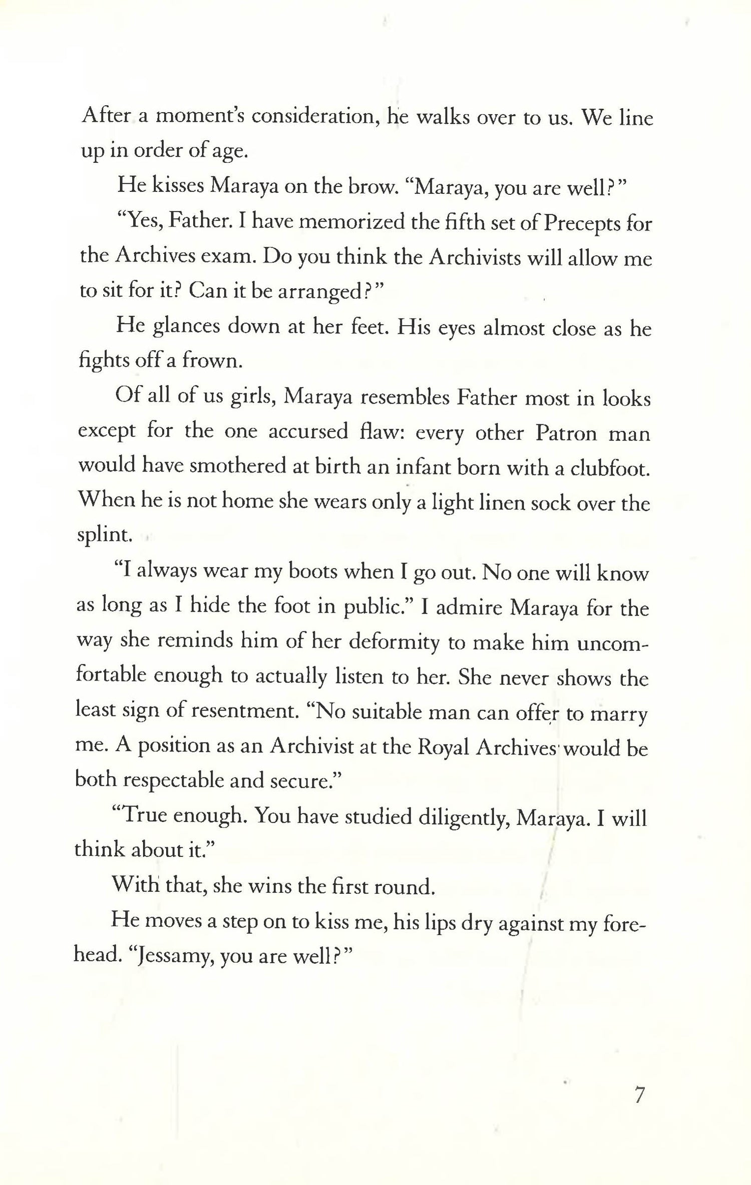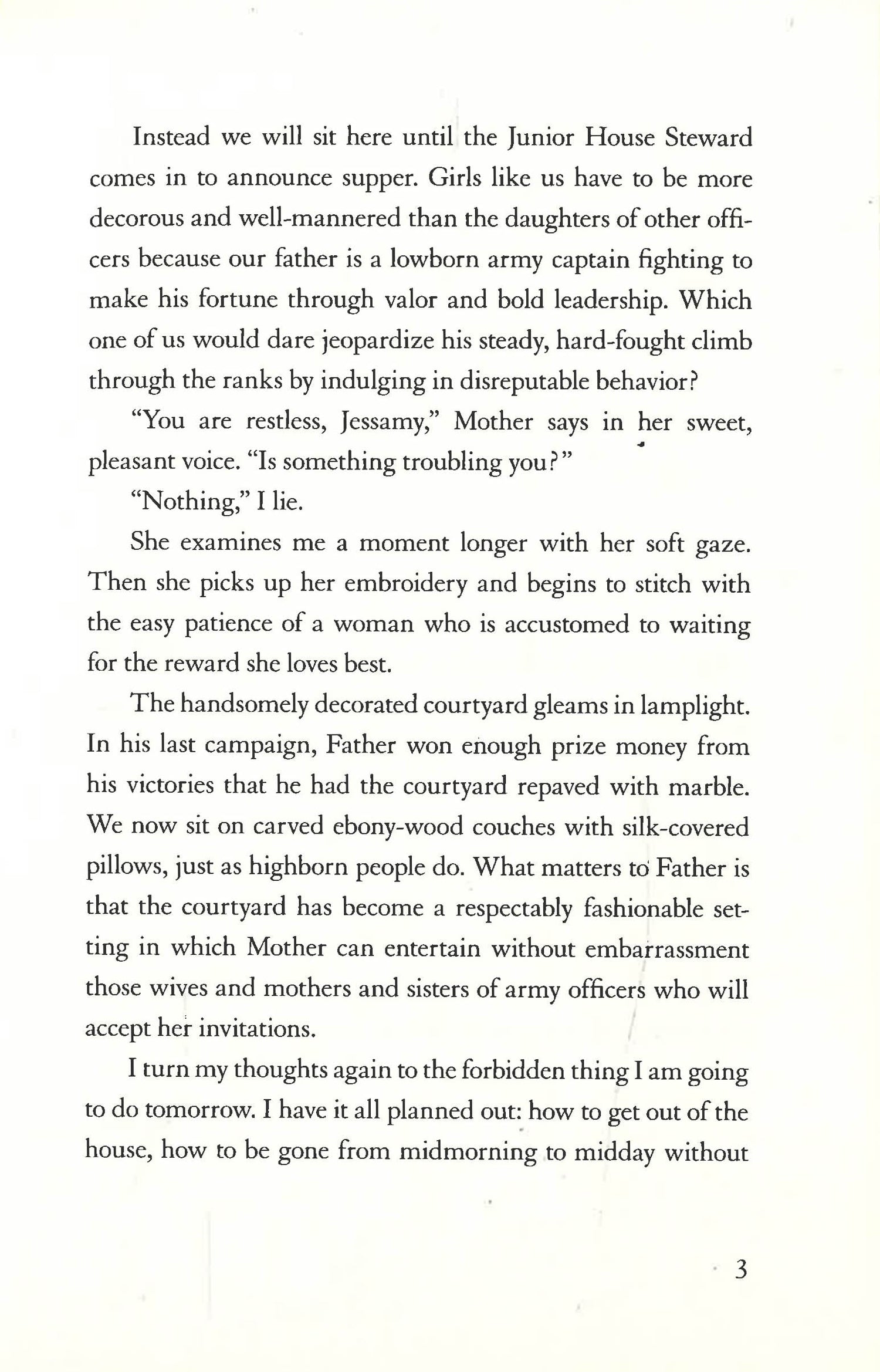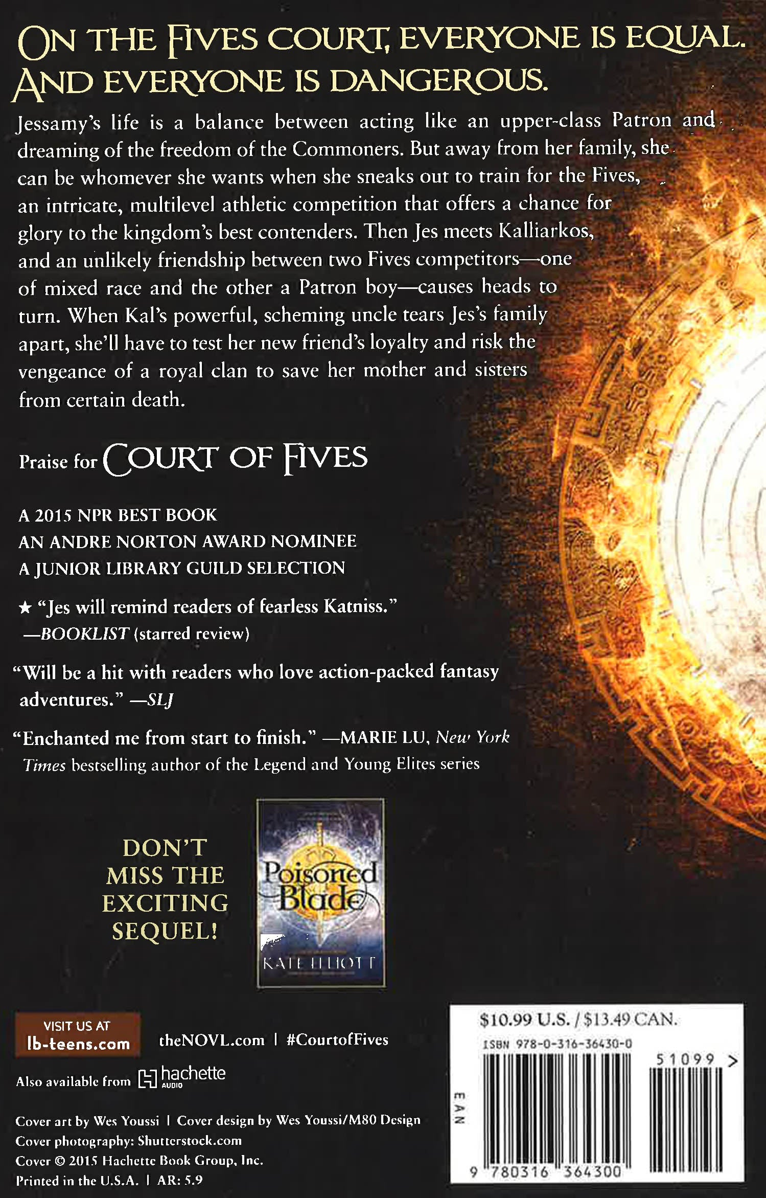 Jessamy's life is a balance between acting like an upper-class Patron and dreaming of the freedom of the Commoners. But away from her family she can be whoever she wants when she sneaks out to train for The Fives, an intricate, multilevel athletic competition that offers a chance for glory to the kingdom's best contenders. Then Jes meets Kalliarkos, and an unlikely friendship between two Fives competitors--one of mixed race and the other a Patron boy--causes heads to turn. When Kal's powerful, scheming uncle tears Jes's family apart, she'll have to test her new friend's loyalty and risk the vengeance of a royal clan to save her mother and sisters from certain death.