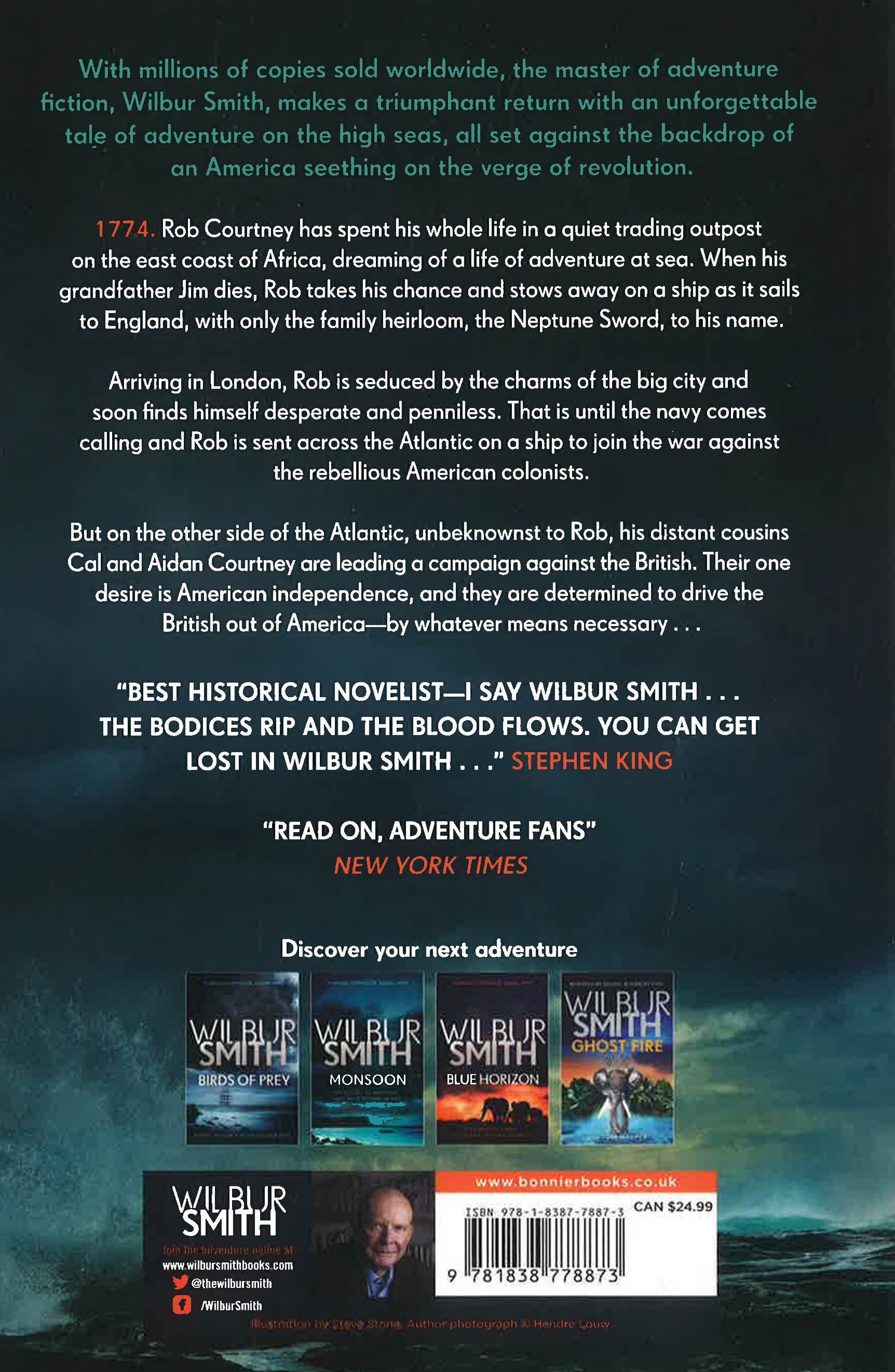 Multimillion copy bestselling author Wilbur Smith returns with a brand-new historical epic, set against the backdrop of the American revolution. The Courtney family is torn apart as three generations fight on opposing sides of a terrible war that will change the face of the world forever. 1774. Rob Courtney has spent his whole life in a quiet trading outpost on the east coast of Africa, dreaming of a life of adventure at sea. When his grandfather Jim dies, Rob takes his chance and stows away on a ship as it sails to England, with only the family heirloom, the Neptune Sword, to his name. Arriving in London, Rob is seduced by the charms of the big city and soon finds himself desperate and penniless. That is until the navy comes calling and Rob is sent across the Atlantic on a ship to join the war against the rebellious American colonists. But on the other side of the Atlantic, unbeknownst to Rob, his distant cousins Cal and Aidan Courtney are leading a campaign against the British. Their one desire is American independence, and they are determined to drive the British out of America - by whatever means necessary. . . A powerful new historical thriller by the master of adventure fiction, Wilbur Smith, of families divided and a country on the brink of revolution. 'Best Historical Novelist' Stephen King 'Wilbur Smith is one of those benchmarks against whom others are compared' The Times