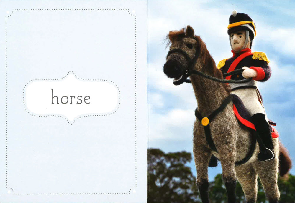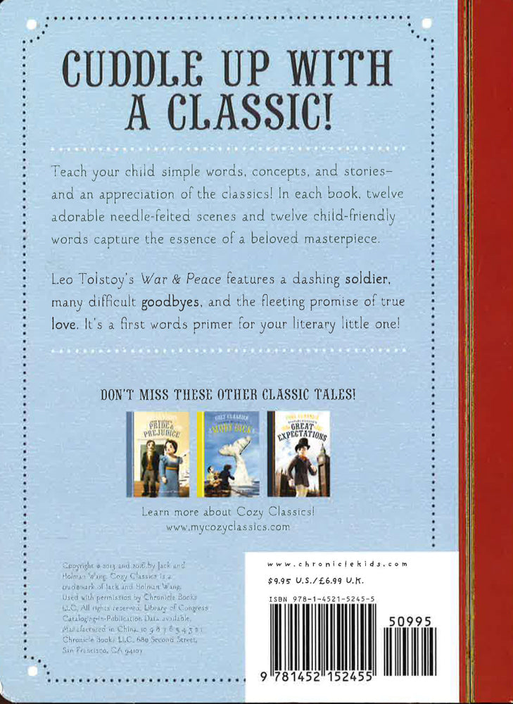 Cuddle up with a classic! In twelve needle-felted scenes and twelve child-friendly words, each book in this ingenious series captures the essence of a literary masterpiece. Simple words, sturdy pages, and a beloved story make these books the perfect vehicle for early learning with an erudite twist. Budding bookworms will delight in this clever retelling of the classics made just for them! Leo Tolstoy's War and Peace features a dashing soldier , many difficult goodbyes , and the fleeting promise of true love . It's a first words primer for your literary little one!