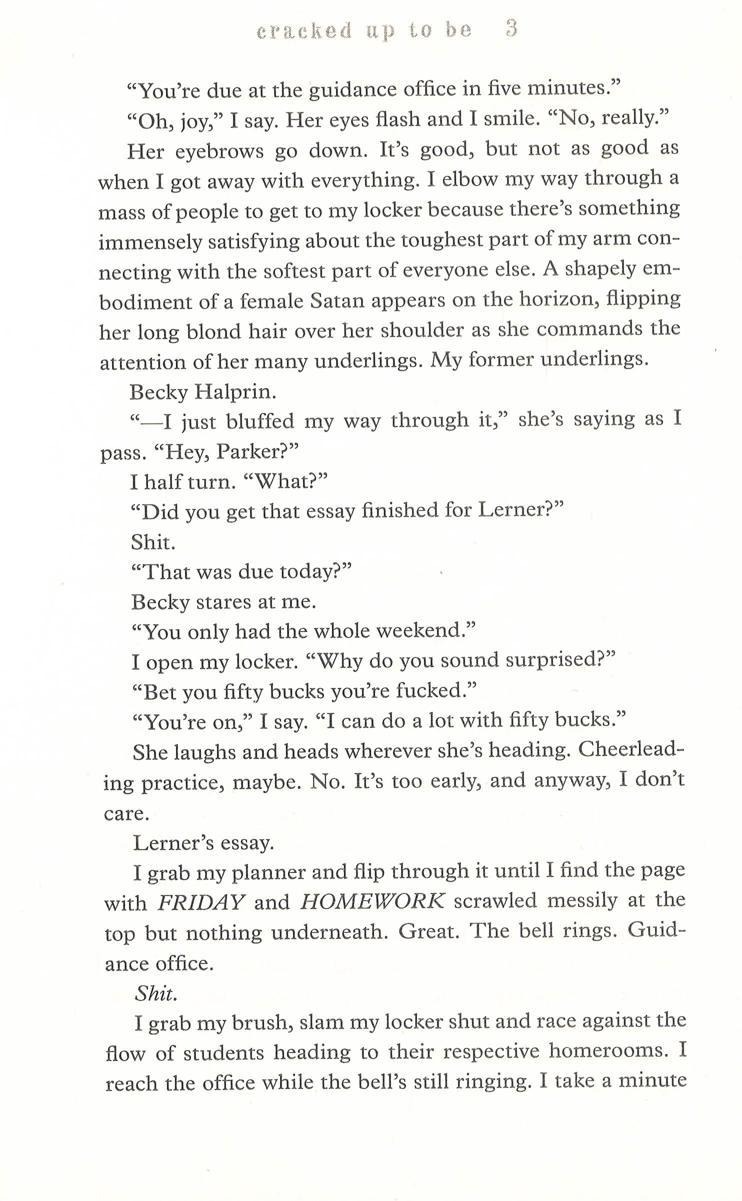 The high price of perfection is one 'Perfect' Parker Fadley always believed she was willing to pay, until the devastating events at a party during junior year fractures the lives of her family and friends. A terrible thing has happened and only Parker knows it's her fault. If being a perfect daughter, student, friend and girlfriend couldn't keep her from making an unforgivable mistake, Parker hopes becoming a perfect mess will at least keep her loved ones from discovering the truth - until the arrival of a curious new student and the unexpected return of an old enemy threaten her tenuous grip on control. Parker will do anything to keep her secret from surfacing . . . but this time the cost might be more than she can afford. The book featuring the unforgettable character that started it all, now with a new foreword from the author.