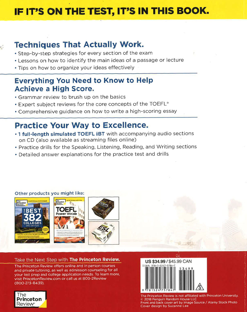 THE PRINCETON REVIEW GETS RESULTS. Get all the prep you need to ace the Test of English as a Foreign Language with a full-length simulated TOEFL iBT test, an MP3 CD with accompanying audio sections, thorough reviews of core topics, and proven strategies for tackling tough questions. Techniques That Actually Work.