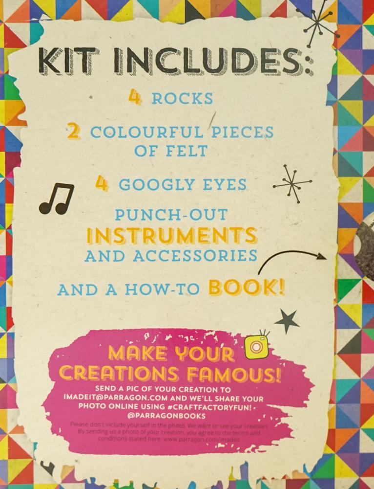 Make your own rock band-with real rocks! This punny kit includes four googly eyes, two pieces of felt, punch-out instruments and accessories, a how-to book and, of course, four rocks! Whether you choose to make a marching band or a divine diva, whether you add a punk rock singer or a rapper, your band will be uniquely your own!