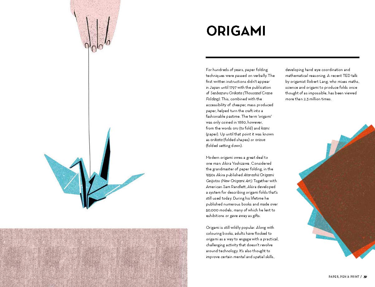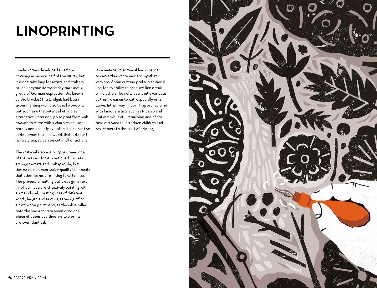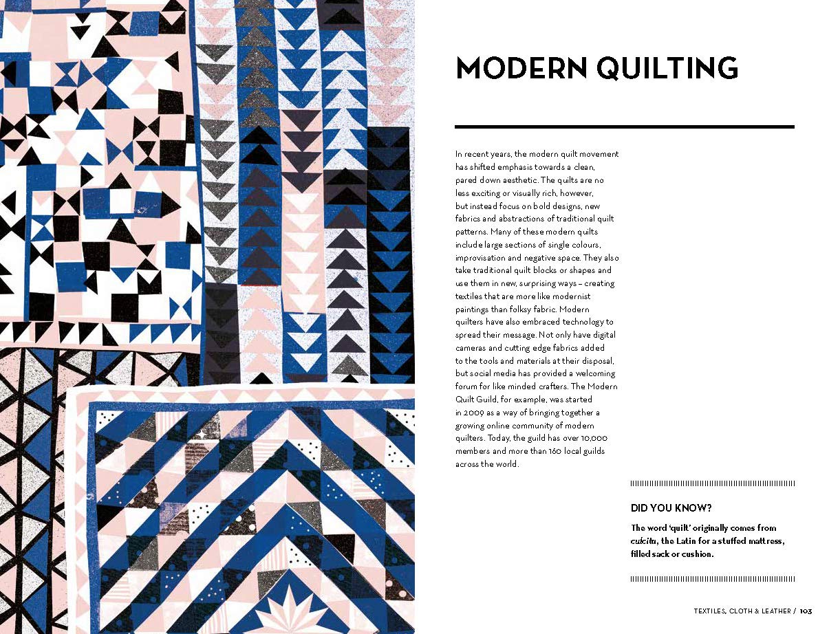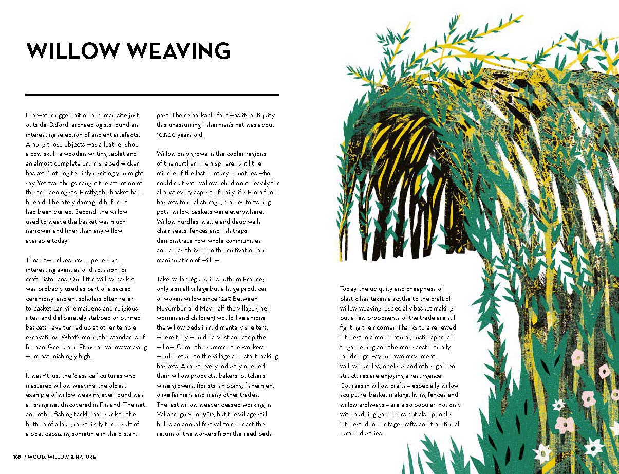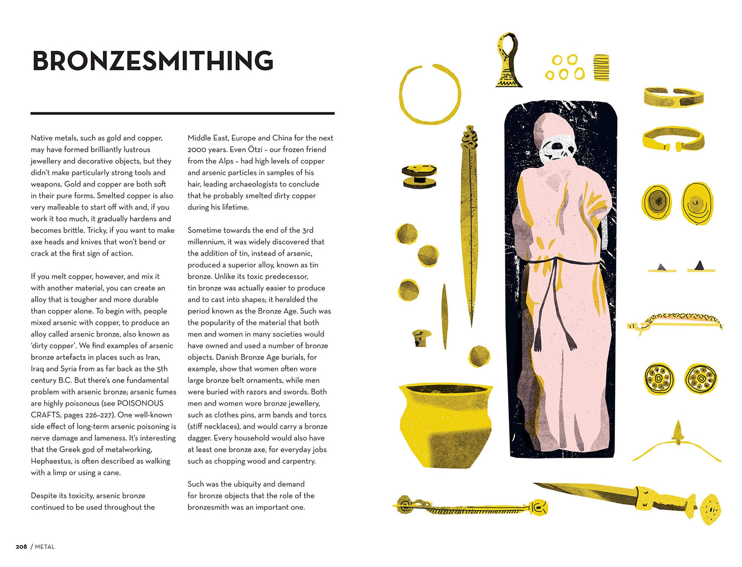 After an introductory section covering the culture of craft (its definition, why it matters, history and community), the main body of the book consists of beautifully illustrated entries on 73 of the world's most established crafts. The scope is encyclopaedic and covers Paper, Pen & Print (bookbinding, origami, calligraphy, lino printing), Textiles, Cloth & Leather (fur & leather, embroidery, knitting, dyeing), Pottery, Glass & Stone (porcelain, stained glass, stone carving), Wood, Willow & Nature (basket weaving, wood carving, lime plastering and thatching) and Metal (gold, bronze, cast iron and steel).