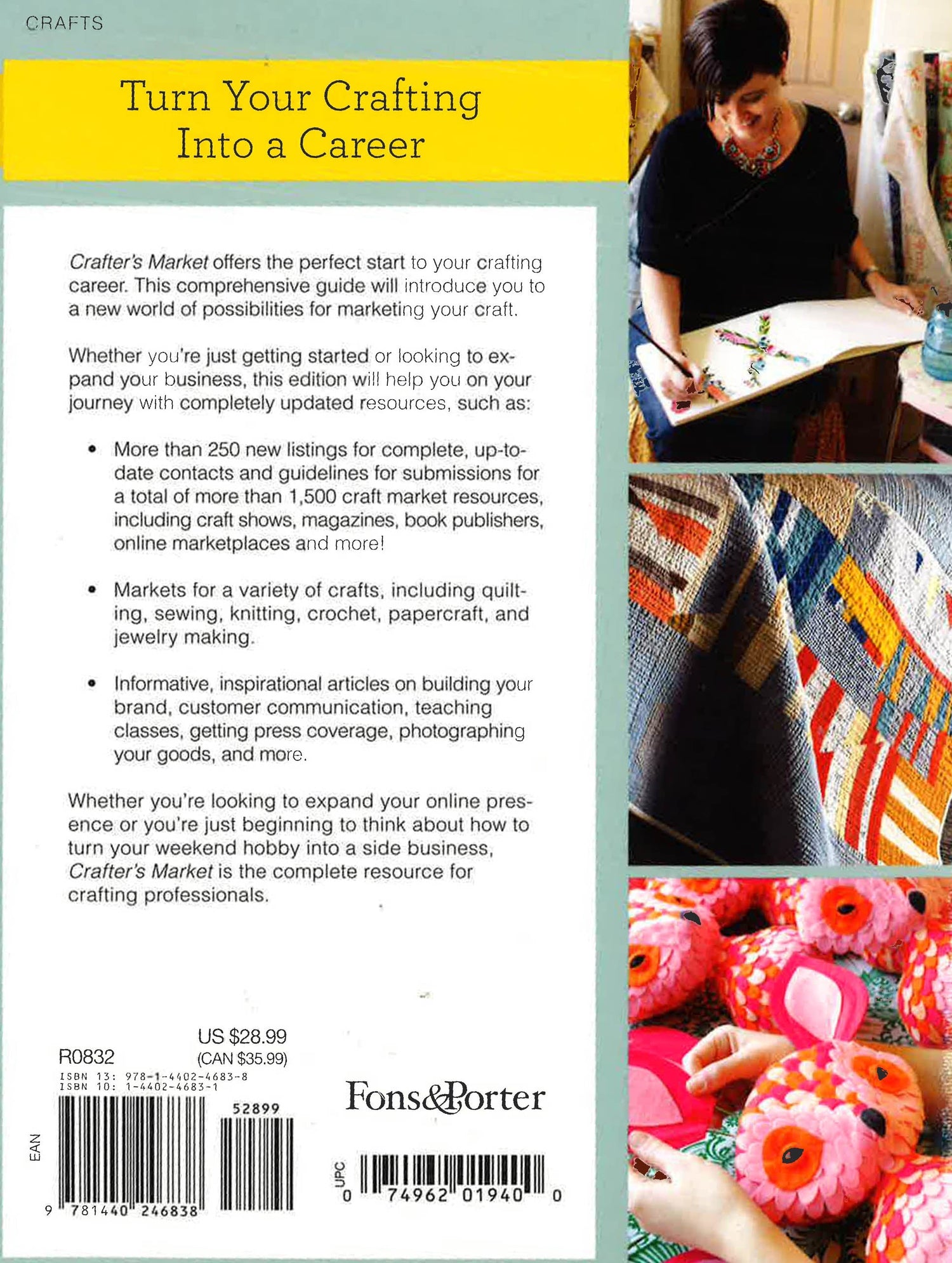 Turn Your Crafting Into a Career! All over the world, creatives are turning their hobby into their livelihoods--and Crafter's Market offers the competitive edge you need to make your craft your career. This comprehensive guide will introduce you to a new world of possibilities for taking your craft to the next level. To help you on your journey, this edition is updated with fresh resources, such as: Over 250 new listings for complete, up-to-date contacts and submission guidelines for more than 1,500 craft market resources, including craft shows, publishers, marketplaces, and more! Informative, inspirational articles on building your brand, customer communication, teaching classes, getting press coverage, photographing your goods, and more, from successful craft business owners. Actions you can take today to grow your business now, no matter your creative medium--quilting, sewing, knitting, crochet, papercraft, or jewelry making! Whether you're looking to expand your online presence or you're just beginning to think about how to turn your weekend hobby into a side business, Crafter's Market is the complete resource for creative professionals.