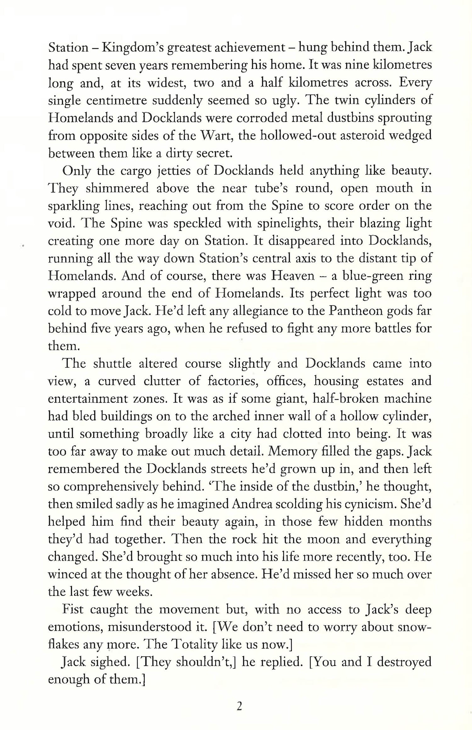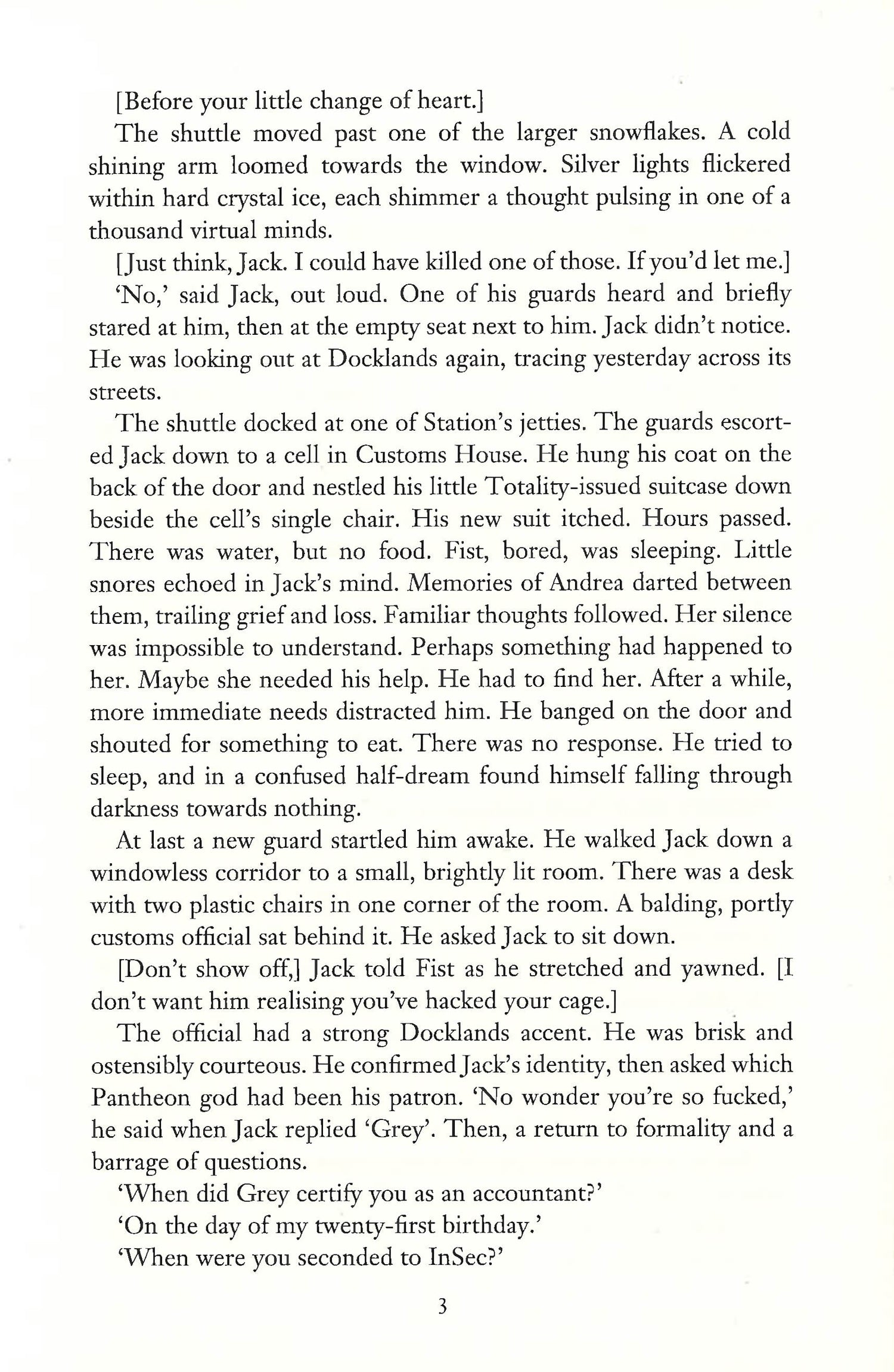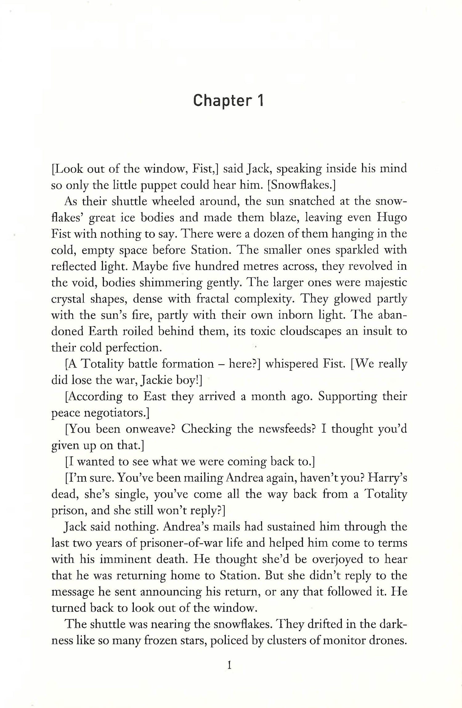 A diamond-hard, visionary new SF thriller. Nailed-down cyberpunk ala William Gibson for the 21st century meets the vivid dark futures of Al Reynolds in this extraordinary debut novel. With Earth abandoned, humanity resides on Station, an industrialised asteroid run by the sentient corporations of the Pantheon. Under their leadership a war has been raging against the Totality - ex-Pantheon AIs gone rogue. With the war over, Jack Forster and his sidekick Hugo Fist, a virtual ventriloquist's dummy tied to Jack's mind and created to destroy the Totality, have returned home. Labelled a traitor for surrendering to the Totality, all Jack wants is to clear his name but when he discovers two old friends have died under suspicious circumstances he also wants answers. Soon he and Fist are embroiled in a conspiracy that threatens not only their future but all of humanity's. But with Fist's software licence about to expire, taking Jack's life with it, can they bring down the real traitors before their time runs out?