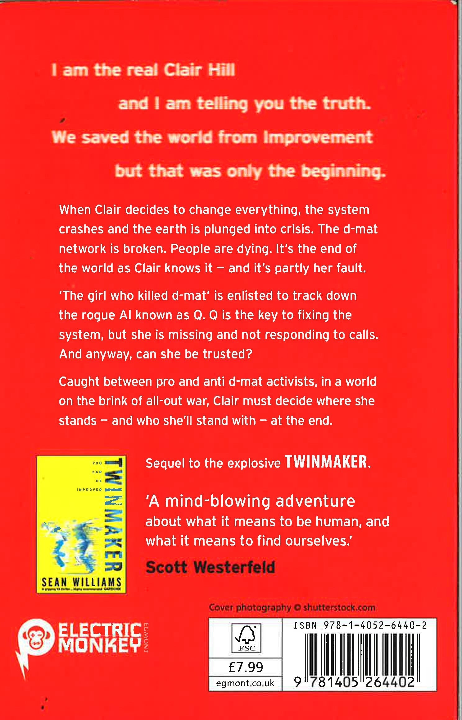 I am the real Clair Hill and I am telling you the truth. We saved the world from Improvement but that was only the beginning. The second enthralling book in the Twinmaker trilogy from New York Times bestselling author Sean Williams. Perfect for fans of GONE and Dr Who. Clair and Jesse have barely been reunited when the earth is plunged into its biggest crisis since the Water Wars. The d-mat network is broken. People are trapped, injured, dying. It's the end of the world as Clair knows it - and it's partly her fault. "The girl who killed d-mat" is enlisted to track down the rogue AI known as Q, who is now missing. Q is the key to fixing the system, but she isn't responding to any calls for help, and anyway, can she be trusted? Caught between pro and anti d-mat philosophies, on the brink of all-out war, Clair must decide where she stands - and who she stands with - at the end. This is an edge of your seat story about technology, identity and friendship. Perfect for fans of Scott Westerfield's Uglies, and Ally Condie's Matched. Sean Williams is a number one New York Times best-selling and award-winning author who has written for adults, teens and younger children, and is well-respected as a sci fi / fantasy author. He has also collaborated with Garth Nix and written for the Star Wars universe.