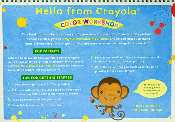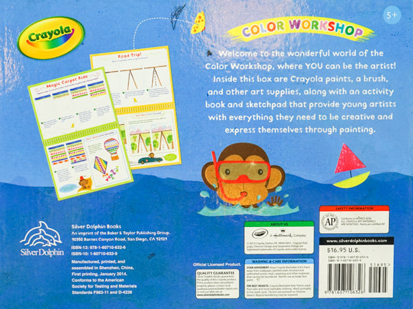 Tap into your creativity and paint a colorful world with Crayola Color Workshop: Painting! Painting is fun and easy with this delightful new kit that comes with everything budding artists need to get painting: a 32-page book, 16-page sketchbook, 18-count Washable Crayola Kids' Paint, one Crayola Paintbrush, paint-mixing tray, and two sponges. Kids ages 5 and up can get creative with more than 15 fun projects, including exploring ways of using color by painting a flying carpet to or creating a cool-looking sea by painting different shades of blue. Crayola Color Workshop: Painting provides hours of fun and great foundation for young Picassos.