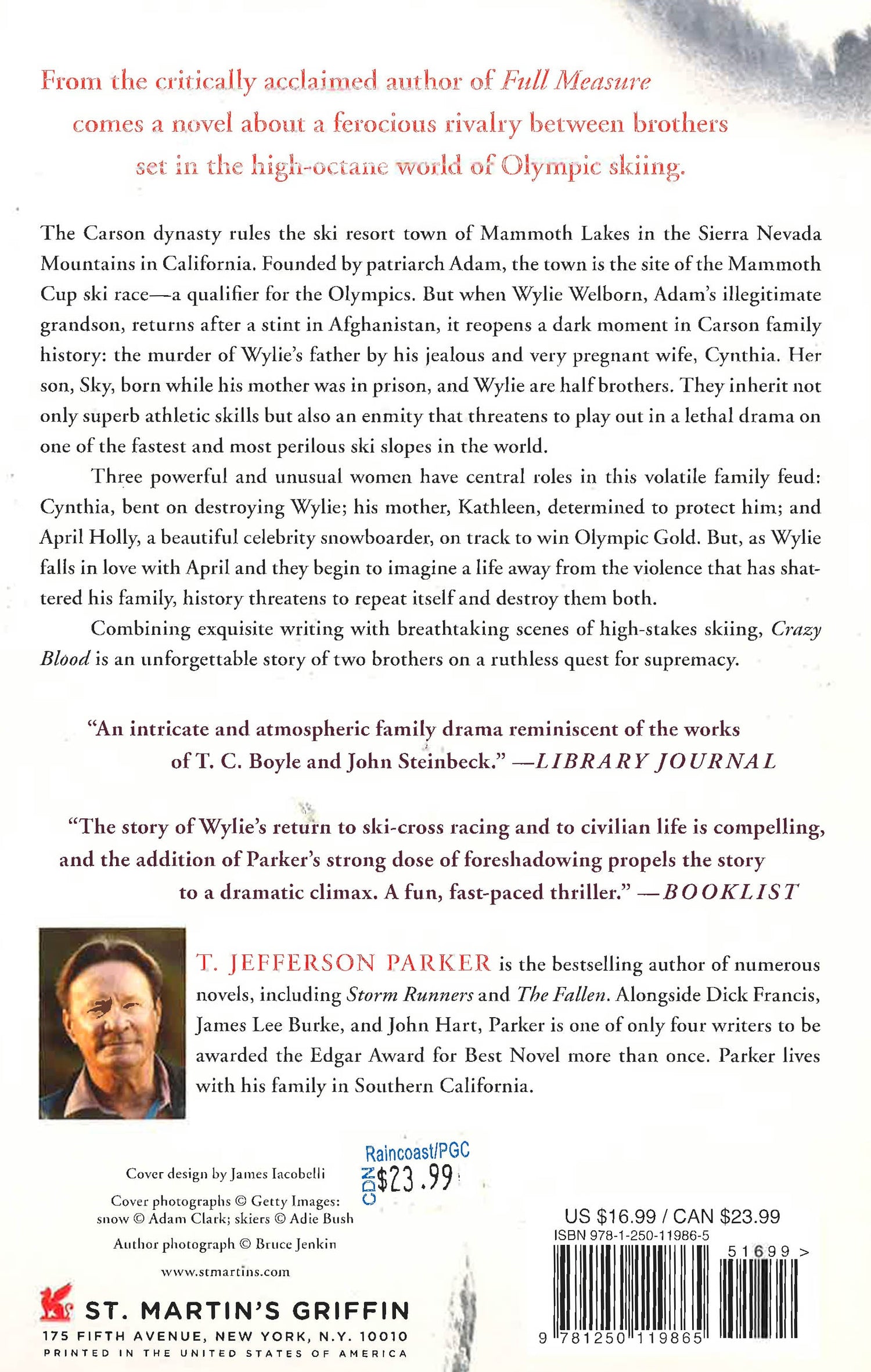 The Carson dynasty rules the ski resort town of Mammoth Lakes in the Sierra Nevada Mountains in California. Founded by patriarch Adam, the town is the site of the Mammoth Cup ski race - a qualifier for the Olympics. But when Wylie Welborn, Adam’s illegitimate grandson, returns after a stint in Afghanistan, it reopens a dark moment in Carson family history: the murder of Wylie’s father by his jealous and very pregnant wife, Cynthia. Her son Sky, born while his mother was in prison, and Wylie are half-brothers. They inherit not only superb athletic skills but an enmity that threatens to play out in a lethal drama on one of the fastest and most perilous ski slopes in the world. Three powerful and unusual women have central roles in this volatile family feud: Cynthia, bent on destroying Wylie; his mother Kathleen, determined to protect him; and April Holly, a beautiful celebrity snowboarder, on track to win Olympic Gold. But, as Wylie falls in love with April and they begin to imagine a life away from the violence that has shattered his family, history threatens to repeat itself and destroy them both.Combining exquisite writing with breathtaking scenes of high stakes skiing, Crazy Blood is an unforgettable story of two brothers on a ruthless quest for supremacy.