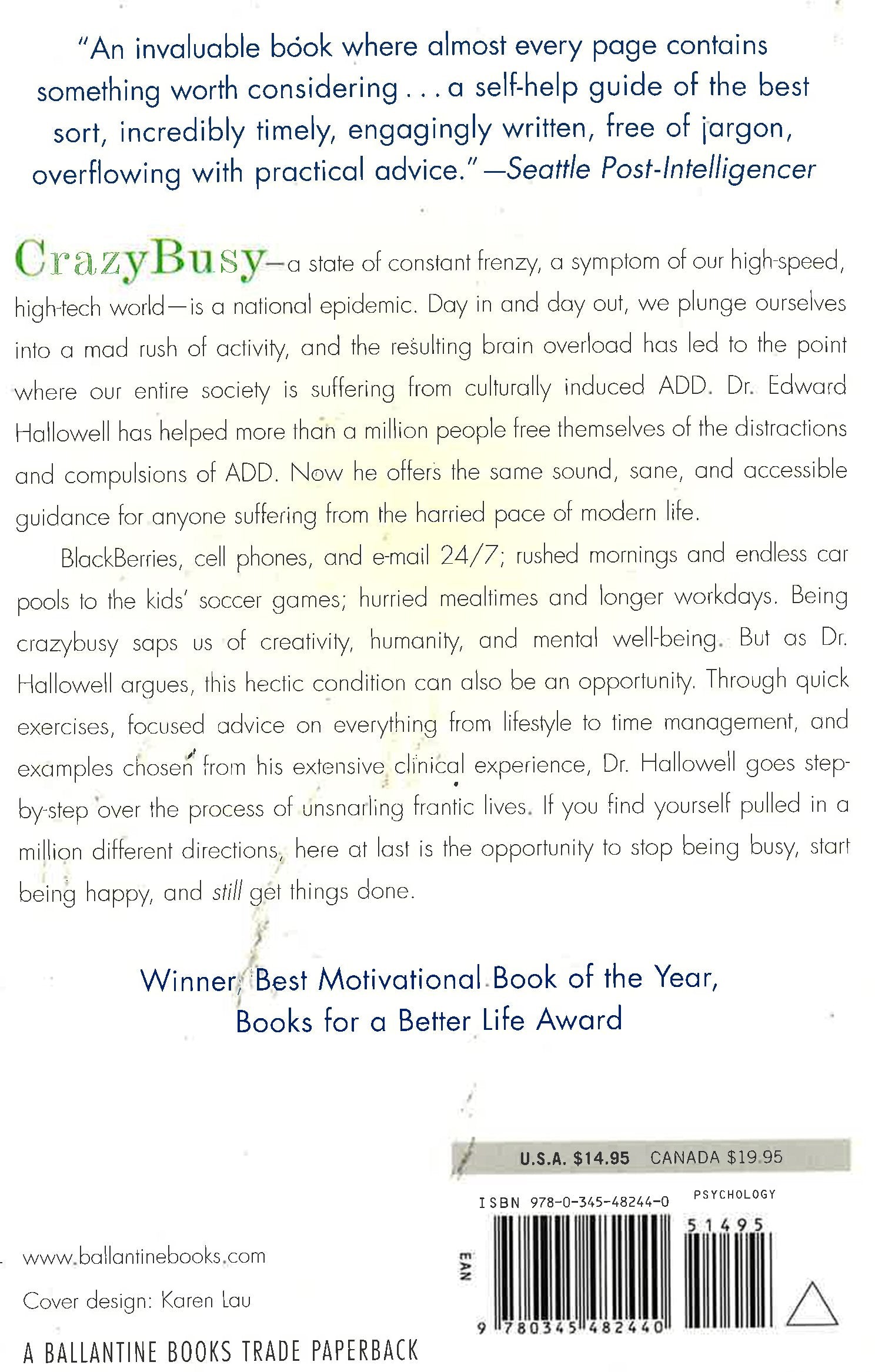 Look at what's happened to the usual how-are-you exchange. It used to go like this: "How are you?" "Fine." Now it often goes like this: "How are you?" "Busy." Or "Too busy." Or simply "Crazy." Without intending for it to happen or knowing how, when, or why it got started, many people now find that they live in a rush they never wanted. If you feel busier than you've ever been and wonder how this happened and how you can keep up the pace much longer, you are hardly alone. Crazy? Maybe not. Dysfunctional? Yes, indeed. We all have more to do than ever before -- and less time to do it. In this highly listenable audiobook, the foremost expert on ADD, Ned Hallowell, explores the society-wide phenomenon of culturally induced ADD. Being busy may very well keep you from doing what matters most, or it may lead you to do things you deem unwise (like getting angry, for example). Being busy is a problem for almost all of us. This audiobook is about both the opportunity and the problem -- where this peculiar life comes from and how to turn it to your advantage. Offering solutions to this difficult, complex problem that might work for you, most importantly, Crazybusy may prompt you to create solutions of your own.
