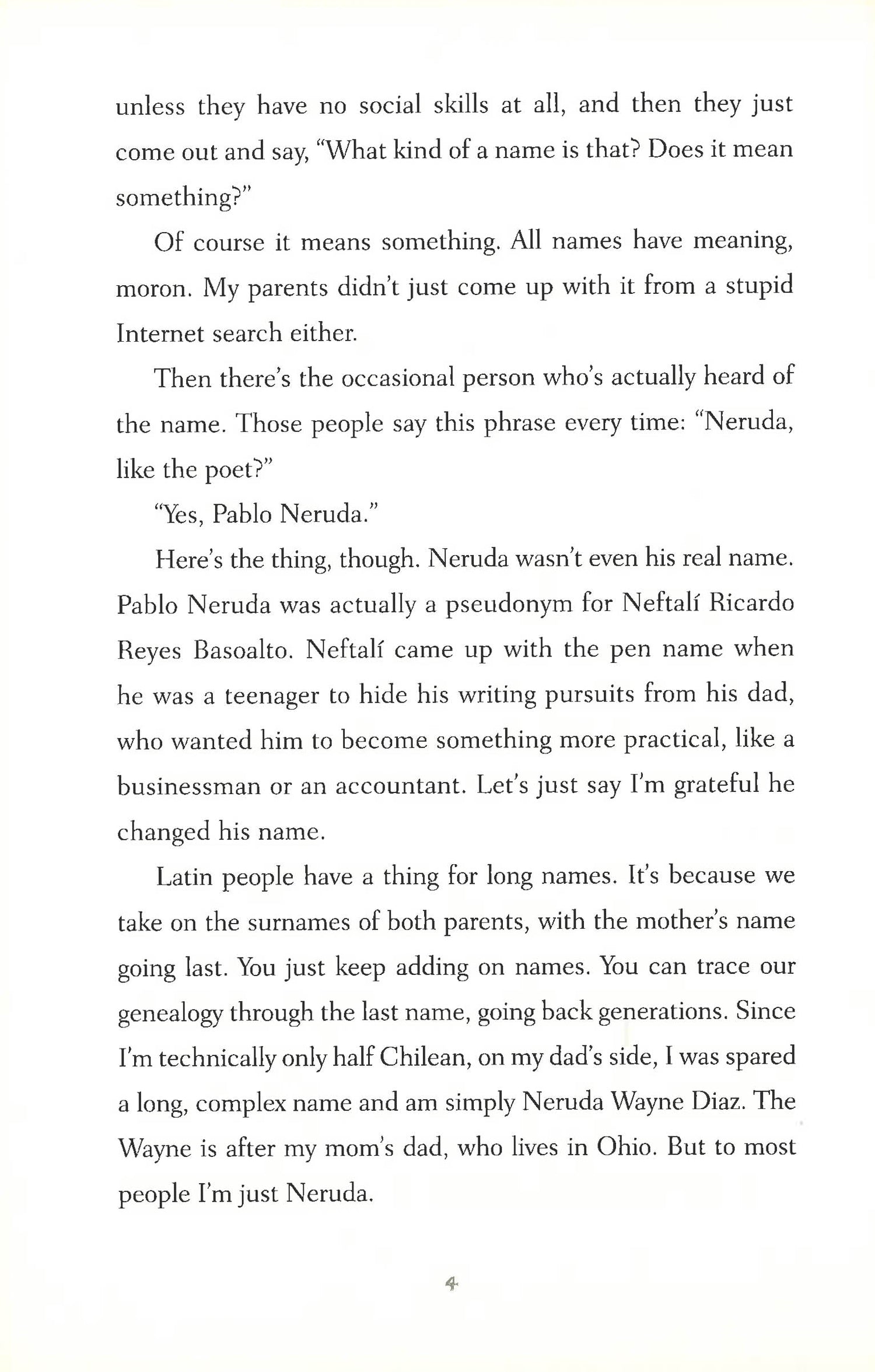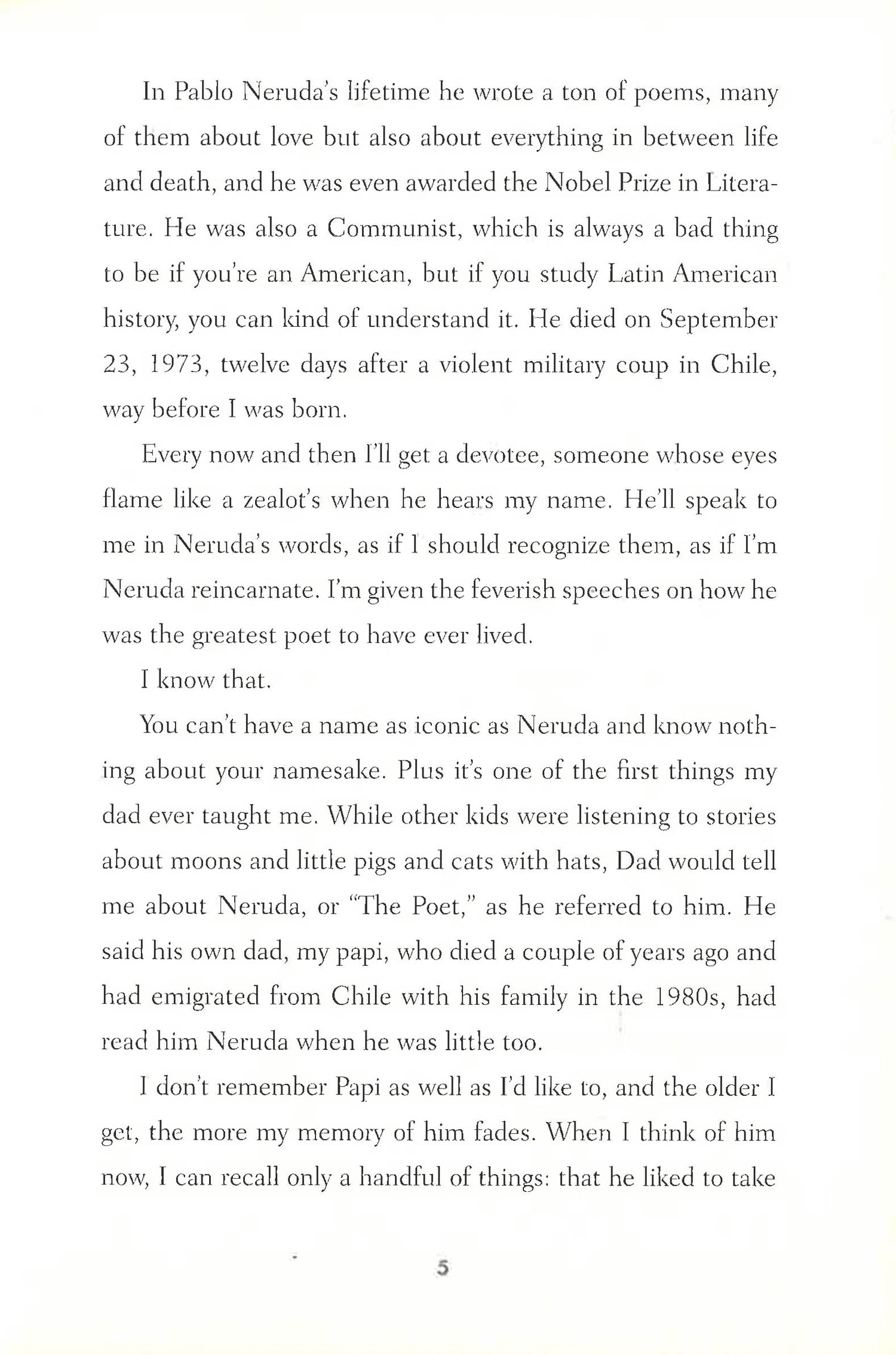 When your namesake is Pablo Neruda - the greatest love poet of all time - finding "the one" should be easy. But for sixteen-year-old Neruda Diaz, it's anything but. He's fallen in love many times - seven to be exact. So, he figures, it's only a matter of time before someone loves him back. Callie could be that someone! She's nothing like the girls Neruda typically falls for, which he considers a good sign. He's thrilled when they become partners on a school assignment. But as they work together and develop an appreciation for the other's artistic abilities and each other - Neruda realises there's one kind of romance he's never considered: a love born from friendship. With his better half in reach and artistic ambitions on track, everything is finally coming together, until Neruda is blindsided by the messy, complicated nature of love - and art - in more ways than one. And when the relationships he's looked to for guidance threaten to implode, Neruda must confront the reality that real love and art is crazy, messy, beautiful, and riskier than just saying the words.