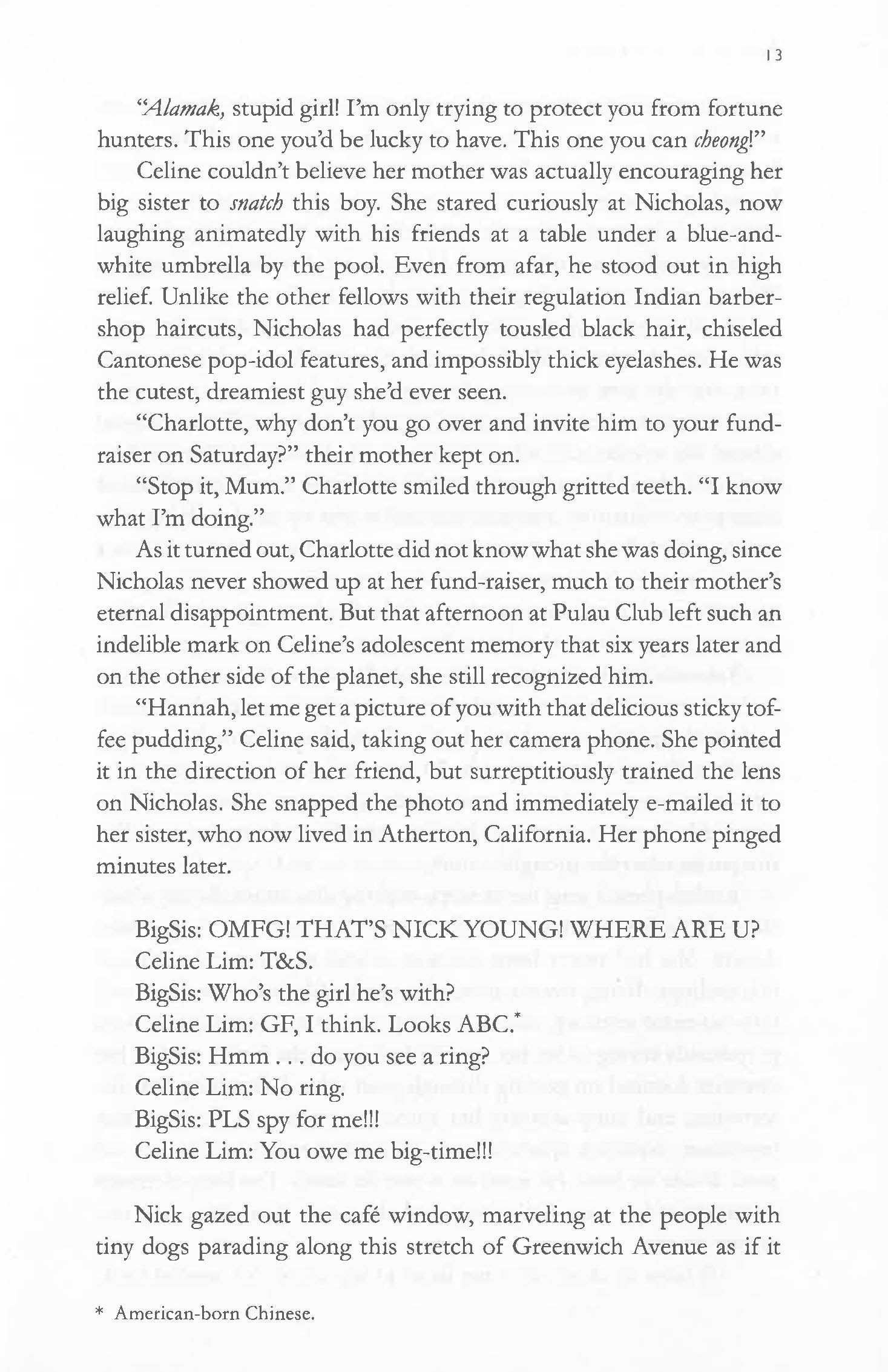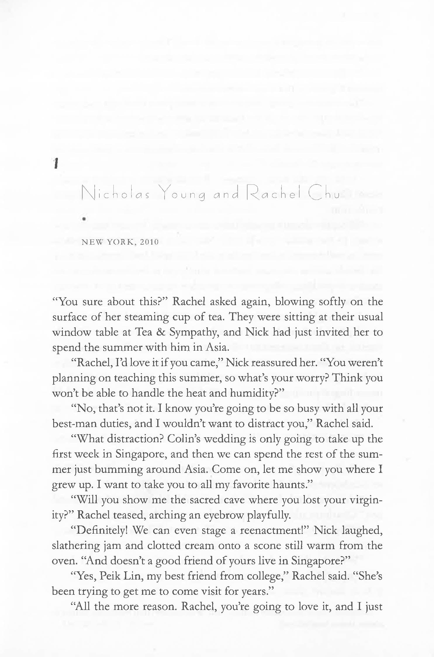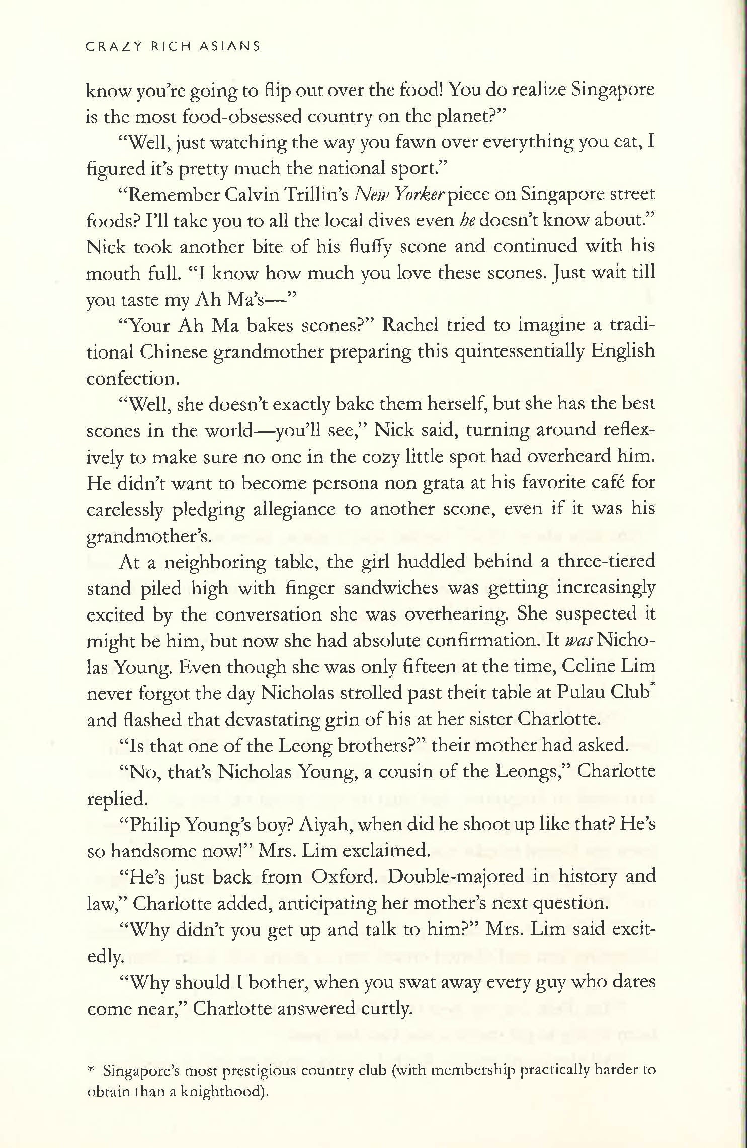 When Rachel Chu agrees to spend the summer in Singapore with her boyfriend, Nicholas young, she envisions a humble family home and time with the man she might one day marry. What she doesn't know is that nicks family home happens to look like a palace, that she'll ride in more private planes than cars and that she is about to encounter the strangest, craziest group of people in existence. Uproarious, addictive, and filled with jaw-dropping opulence, crazy rich Asians is an insider look at the Asian jet set; a perfect depiction of the clash between old money and new money - and a fabulous novel about what it means to be young, in love, and gloriously, crazily rich.