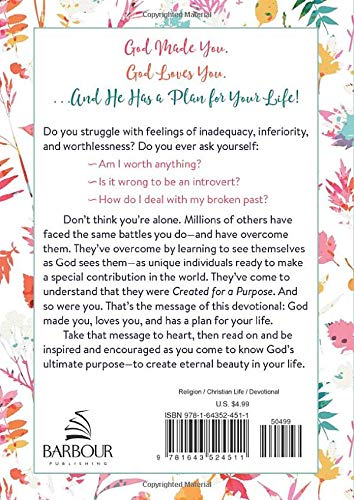 Don’t think you’re alone. Millions of others have faced the same battles you do—and have overcome them. They’ve been victorious by learning to see themselves as God sees them—as unique individuals ready to make a special contribution in the world. They’ve come to understand that they were Created for a Purpose. And so were you. That’s the message of this devotional: God made you, loves you, and has a plan for your life.