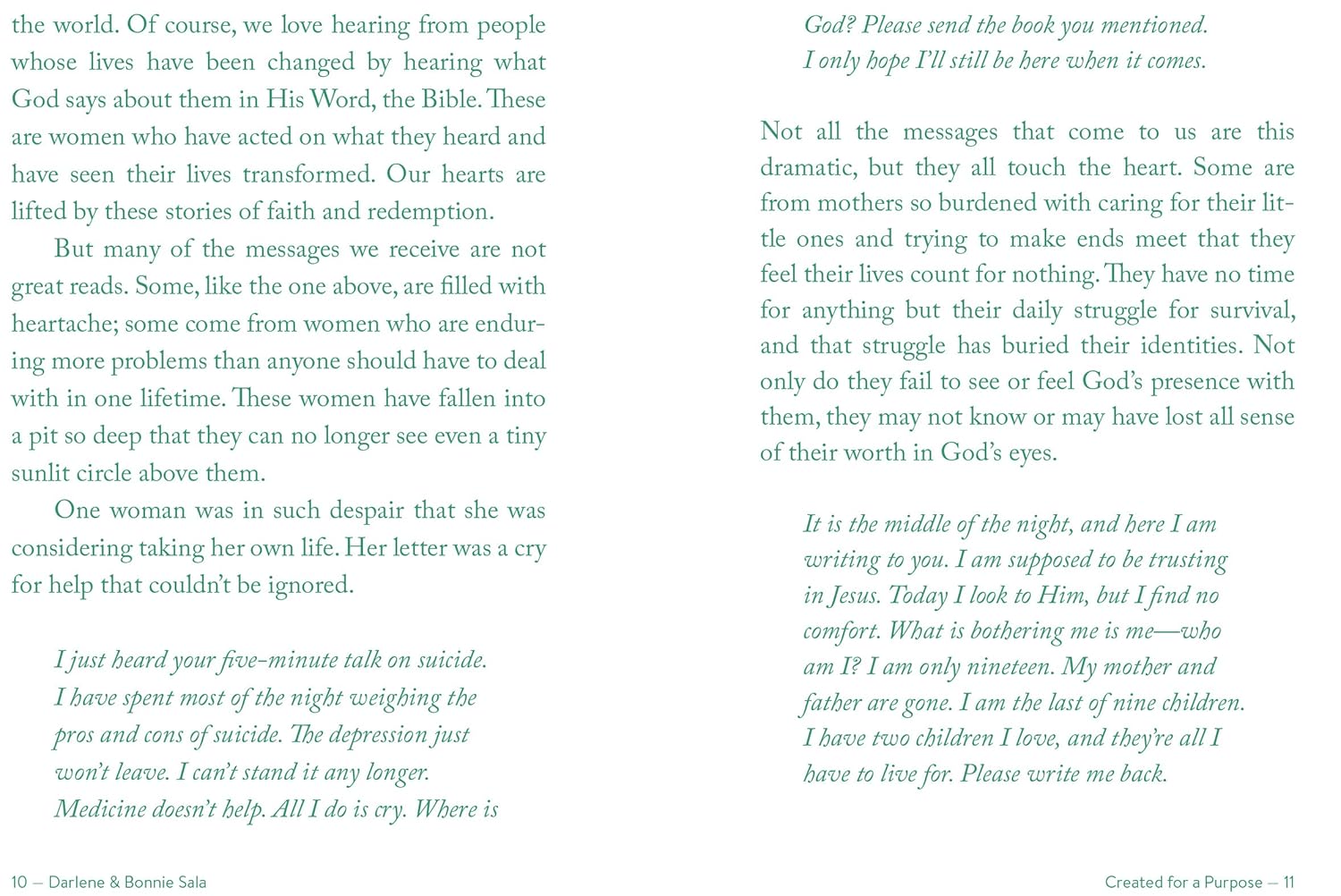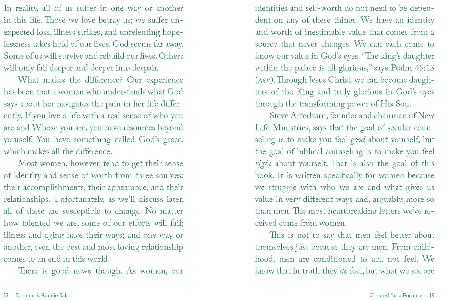 The original Created for a Purpose by Darlene Sala changed the lives of women around the world by helping them find their unchanging worth in God. Today’s woman wonders more than ever, if she is enough. With daughter Bonnie Sala, the new Created for a Purpose encourages women of all ages with the message that, despite cultural changes, the relentless pressure of social media and real-life issues like abuse, inadequacy and the pressure to achieve, you can know who you are and why you are here. You can live out the beauty, that is the purpose for which God created you.