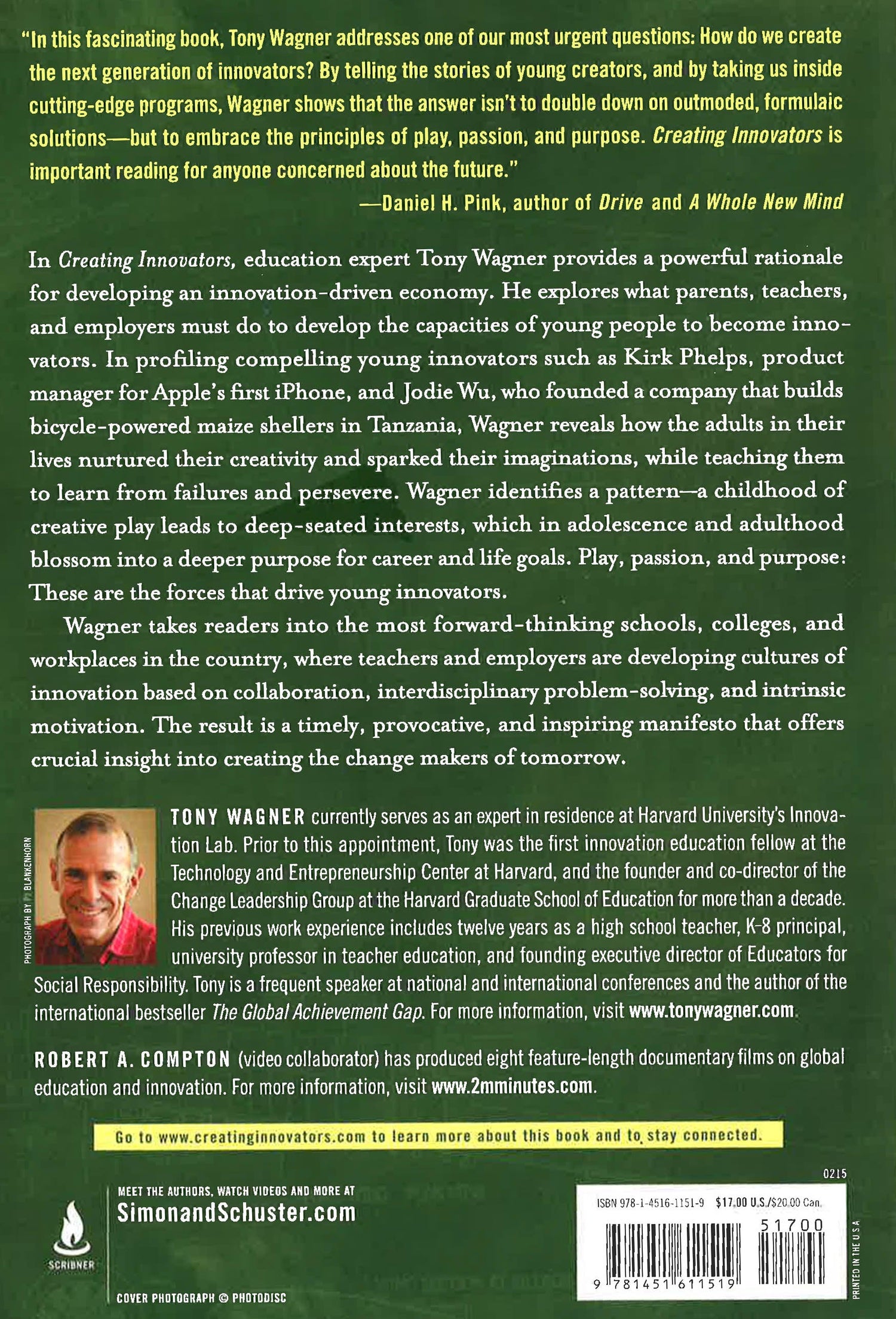 Tony Wagner's groundbreaking bestseller--"a road map for parents who want to sculpt their children into innovative thinkers" (USA TODAY) and a guide for "an employer looking to have a pipeline of creative talent" (Tim Brown, CEO of IDEO). Harvard education expert Tony Wagner explores what parents, teachers, and employers must do to develop the capacities of young people to become innovators. In profiling compelling young American innovators such as Kirk Phelps, product manager for Apple's first iPhone, and Jodie Wu, who founded a company that builds bicycle-powered maize shellers in Tanzania, Wagner reveals how the adults in their lives nurtured their creativity and sparked their imaginations, while teaching them to learn from failures and persevere. Play, passion, and purpose: These are the forces that drive young innovators. Wagner takes readers into the most forward-thinking schools, colleges, and workplaces in the country, where teachers and employers are developing cultures of innovation based on collaboration, interdisciplinary problem-solving, and intrinsic motivation. The result is a timely, provocative, and inspiring manifesto that offers crucial insight into creating the change makers of tomorrow. *This Book may have remainder mark.