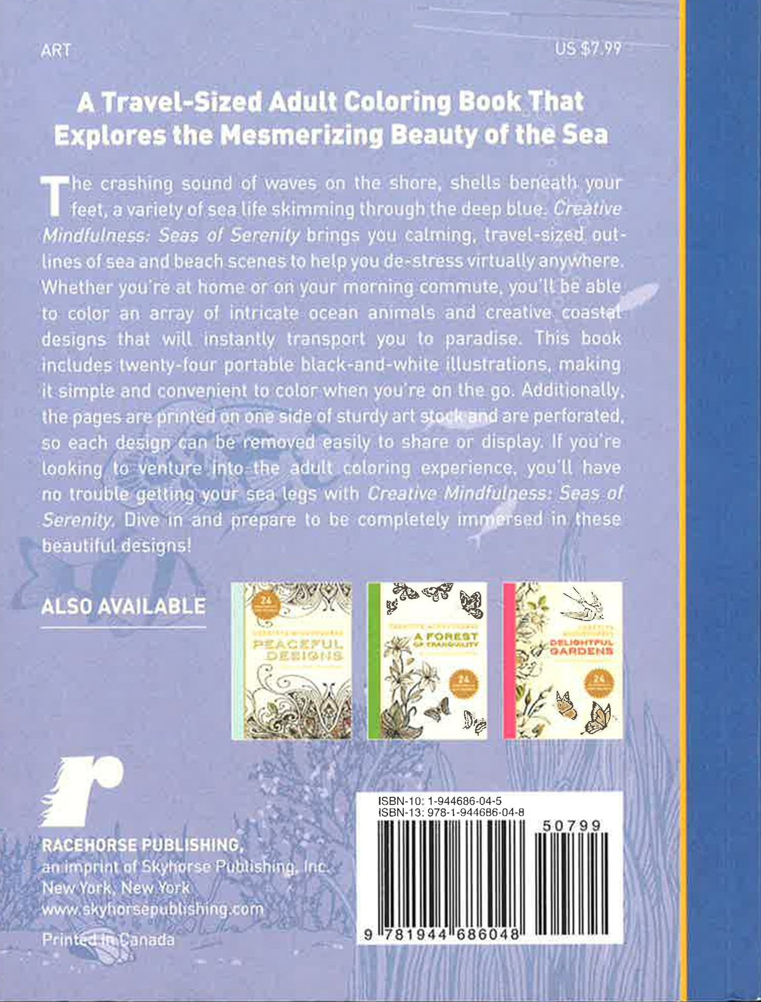 Crushing waves of stress? Ride them out with this adult coloring book that explores the mesmerizing beauty of the sea. The crashing sound of waves on the shore, shells beneath your feet, a variety of sea life skimming through the deep blue. Creative Mindfulness: Seas of Serenity brings you calming, travel-sized outlines of sea and beach scenes to help you de-stress virtually anywhere. Whether you're at home or on your morning commute, you'll be able to color an array of intricate ocean animals and creative coastal designs. Adult coloring provides an artistic outlet for stress that aids in alleviating everyday pressures--many of which occur while we're active and not in the comfort of our homes. However, many books are often restricted to oversized pages that require a large surface to color. These twenty-four black-and-white illustrations are travel-sized, making it simple and convenient to color when you're on the go. The pages are perforated and printed on one side, so each design can be removed to share or display. Additionally, the book is printed on a sturdy art stock that accommodates any coloring medium--whether it's markers, crayons, colored pencils, or pens. This book features: Twenty-four original black-and-white designs for your coloring pleasure on single-sided perforated pages High-quality, sturdy paper that can withstand travel and wear-and-tear Perfectly sized illustrations to fit in pockets and bags If you're looking to venture into the adult coloring experience, you'll have no trouble getting your sea legs with Creative Mindfulness: Seas of Serenity. Whether you are an artist looking to improve your craft, someone seeking a way to find inner peace, or simply want to give the gift of coloring, this travel-sized book is a must-have that will transport you to paradise. It's guaranteed to provide hours of creative relaxation. So dive in and prepare to be completely immersed in these beautiful designs!