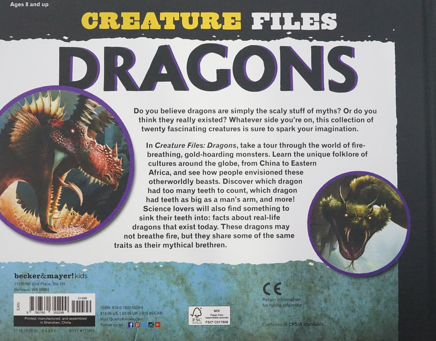 In Creature Files: Dragons, you'll take a tour through the world of fire-breathing, gold-hoarding, three-headed monsters and discover where and how these magical creatures came to be. Learn the unique folklore of cultures around the globe, from China to Russia to Eastern Africa, and see how people envisioned these otherworldly beasts through lush and evocative illustrations.