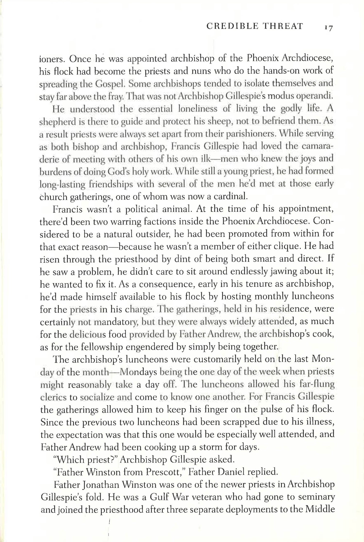 Years after her son’s fatal overdose, grieving mother Rachel Higgins learns that his addiction may have grown out of damage suffered at the hands of a pedophile priest while he was in high school. Looking for vengeance, she targets the Catholic Church’s most visible local figure, Archbishop Francis Gillespie. When the archbishop begins receiving anonymous threats, local police dismiss them, saying they’re not credible. So he turns to his friends, Ali Reynolds and her husband, B. Simpson.