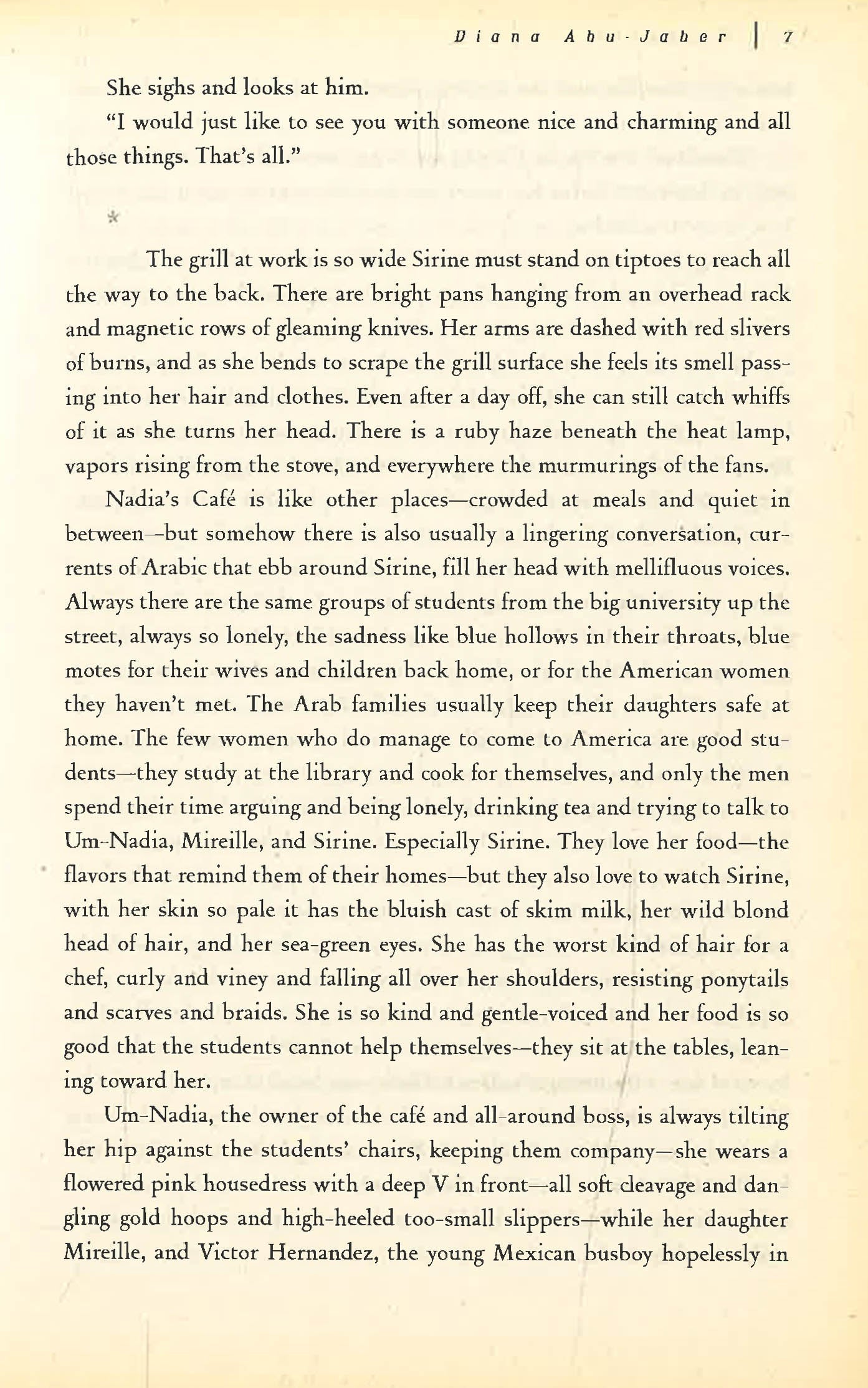 Sirine is thirty-nine and a breathtaking golden-haired beauty. Half-Iraqi and half-American, she was raised in Los Angeles by her Iraqi-born uncle -- a professor at the local university and an endless source of fabulous tales of jinns, sheiks and Bedouins -- after her aid-worker parents were killed in Africa. An exquisitely gifted cook at Cafe Nadia, where homesick Middle Eastern ex-pats collect to drink coffee and savour her perfectly spiced food, Sirine is loved by all. She has, however, never been in love herself, and it is her uncle's dearest wish that she will fall for dashing new college professor, Hanif Al Eyad, a political exile from Baghdad. The two meet at Cafe Nadia and from the start their relationship is steeped in the scents, flavours and textures of Sirine's cooking. But Sirine is not convinced that they have the right ingredients for a life of happy-ever-after; in particular, she worries that she is too American for Hanif.