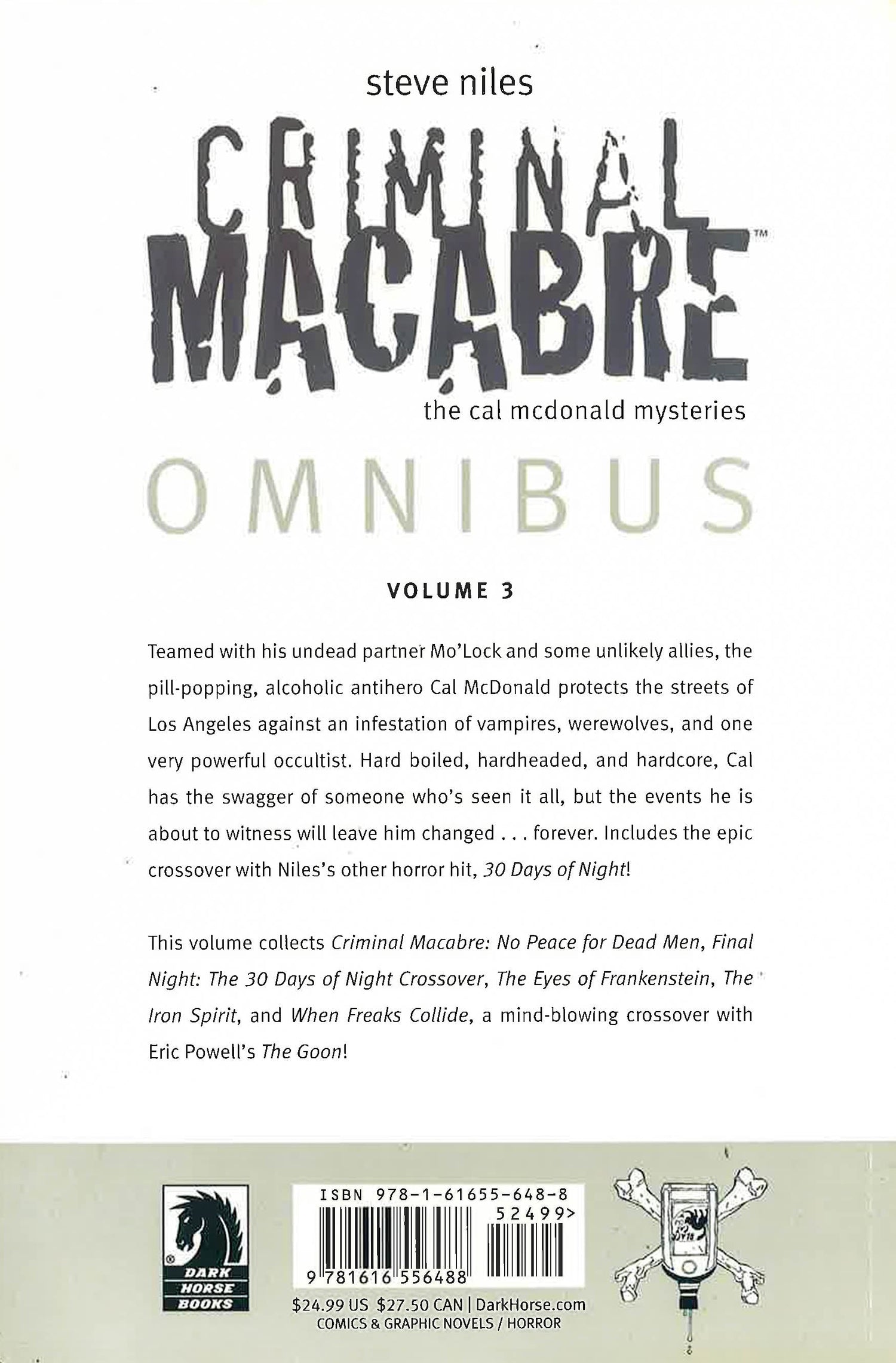 Teamed with his undead partner Mo'Lock and some unlikely allies, the pill-popping, alcoholic antihero Cal McDonald protects the streets of Los Angeles against an infestation of vampires, werewolves, and one very powerful occultist. The events will leave Cal changed . . . forever. Includes the epic crossover with Niles's other horror hit, 30 Days of Night! Collects Criminal Macabre: No Peace for Dead Men, Final Night--The 30 Days of Night Crossover, The Eyes of Frankenstein, and The Iron Spirit.
