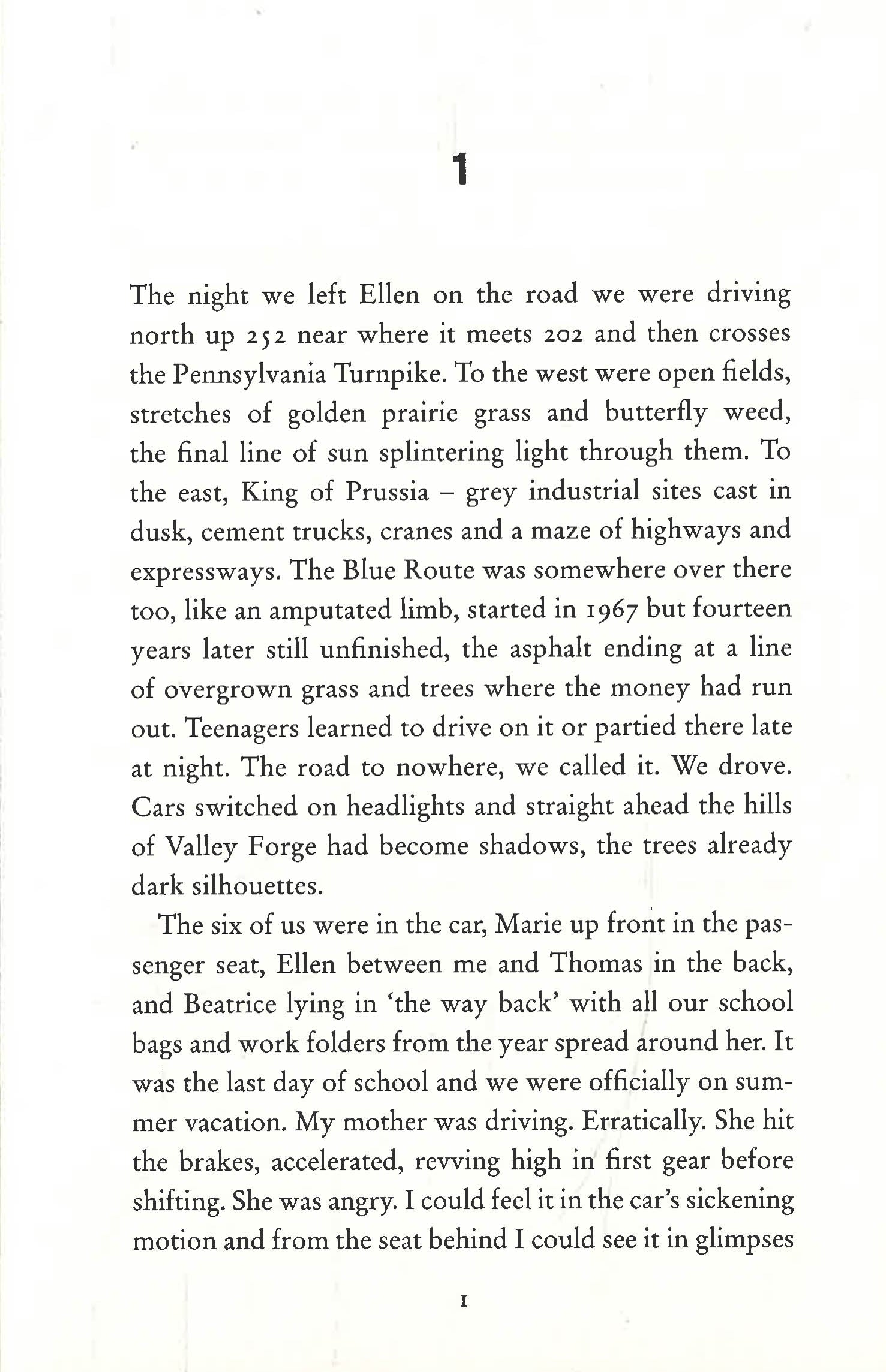 Rage. That's the feeling engulfing the car as Ellen's mother swerves over to the hard-shoulder and orders her daughter out onto the roadside. Ignoring the protests of her other children, she accelerates away, leaving Ellen standing on the gravel verge in her school pinafore and knee socks as the light fades.
