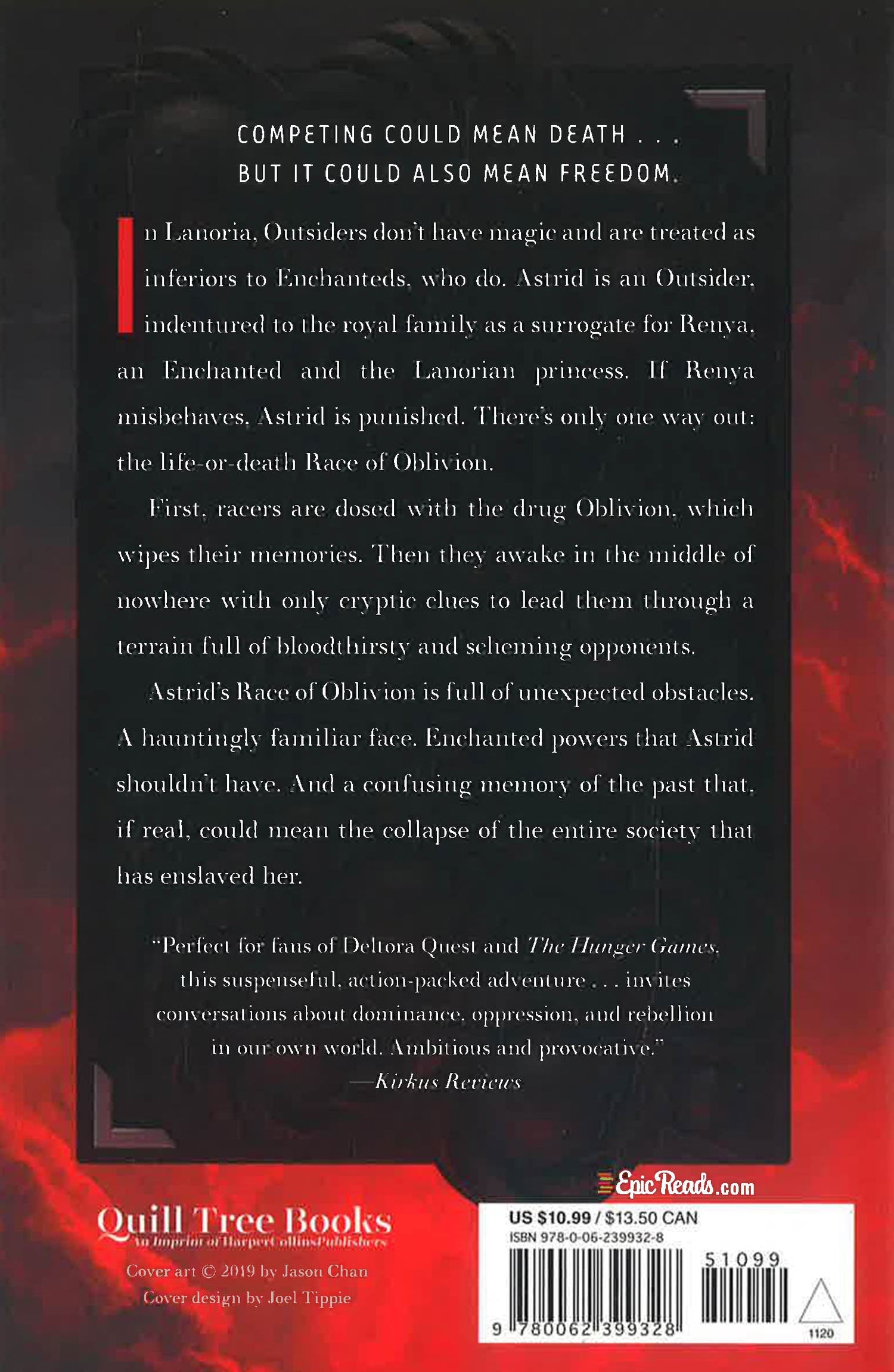 But there is a way out: the life-or-death Race of Oblivion. First, racers are dosed with the drug Oblivion, which wipes their memories. Then, when they awake in the middle of nowhere, only cryptic clues—and a sheer will to live—will lead them through treacherous terrain full of opponents who wouldn’t think twice about killing each other to get ahead.