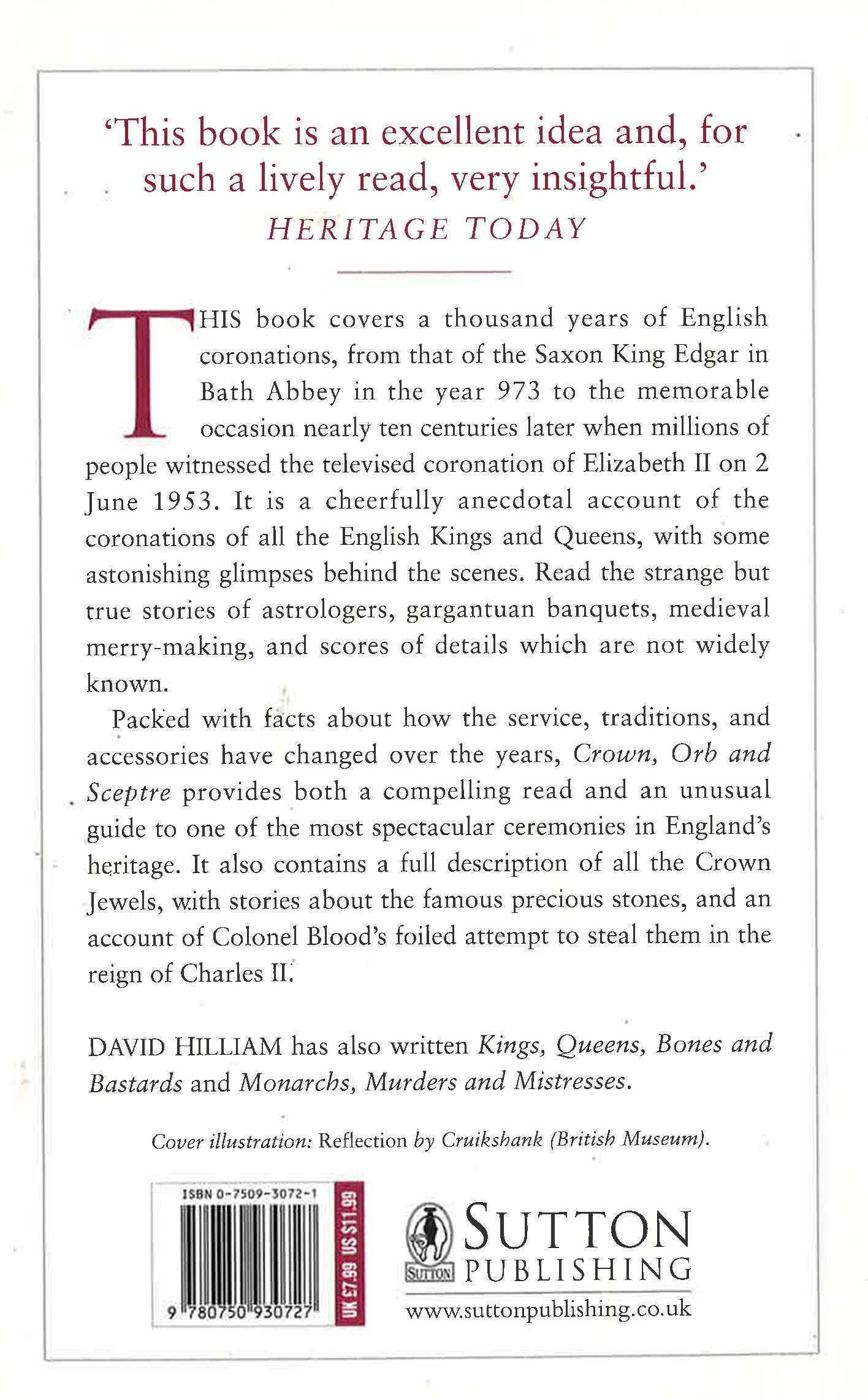 Coronations are very public occasions, typically seen as meticulously planned formal ceremonies where everything runs smoothly. But behind the scenes at Westminster Abbey lie extraordinary but true stories of mayhem, confusion and merriment. In this book we travel through one thousand years of England's history to reveal the real characters of its kings and queens. Packed with facts about how the service, traditions, and accessories have changed over the years, Crown, Orb and Sceptre provides both a compelling read and an irreverent guide to one of the most spectacular ceremonies in England's heritage.