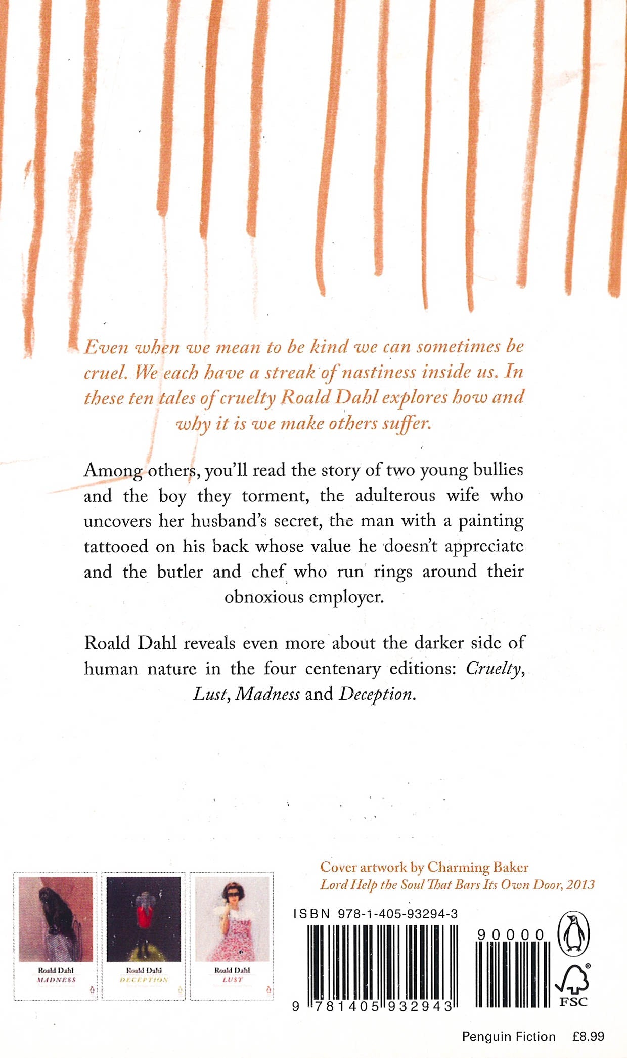 Cruelty has a human heart . . .' Even when we mean to be kind we can sometimes be cruel. We each have a streak of nastiness inside us. In these ten tales of cruelty master storyteller Roald Dahl explores how and why it is we make others suffer. Among others, you'll read the story of two young bullies and the boy they torment, the adulterous wife who uncovers her husband's secret, the man with a painting tattooed on his back whose value he doesn't appreciate and the butler and chef who run rings around their obnoxious employer. Dahl understood our deepest secrets, desires and fears and Cruelty is one of four books - the rest being Lust, Deception and Madness - that explore our hidden selves.