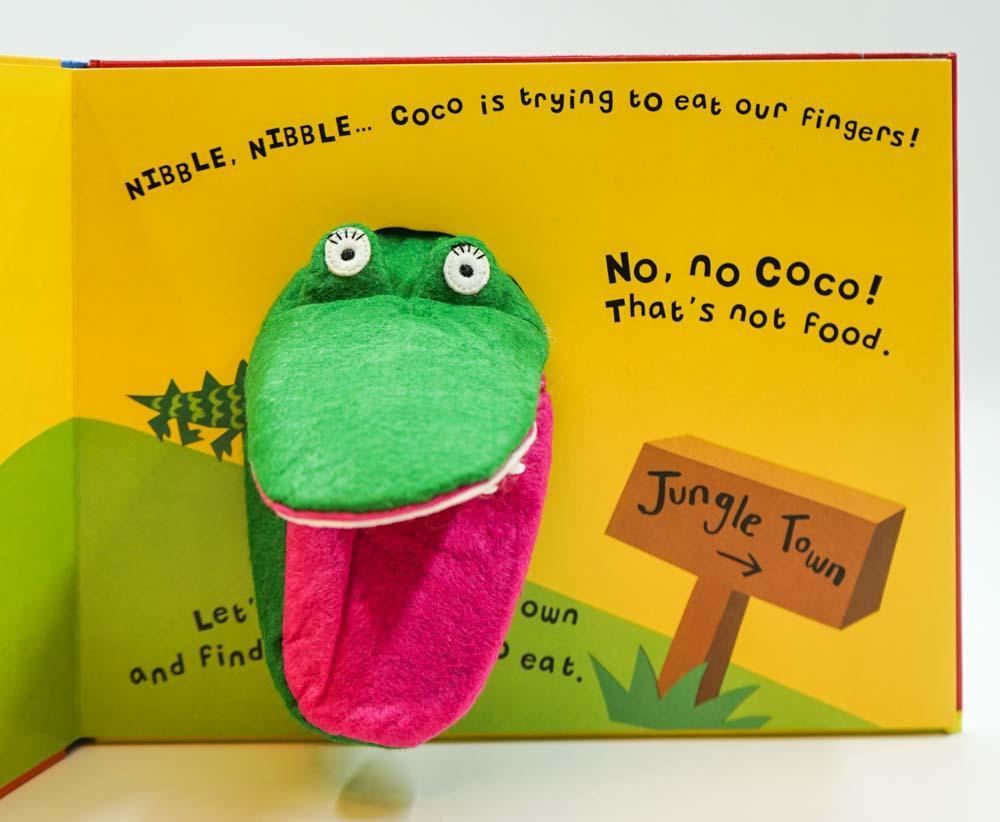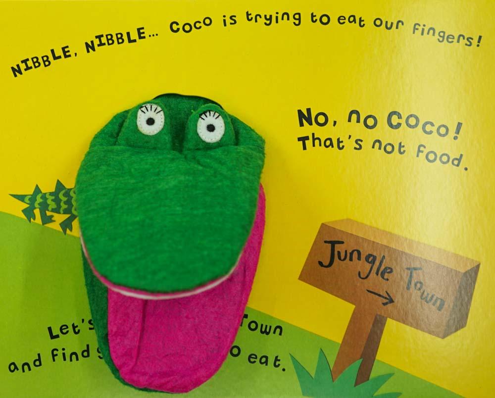 Coco is a crocodile who loves to chomp on the wrong things. Can you help her pick good things to munch and crunch as she visits the fruit stall, cafe and vegetable shop in Jungle Town? The combination of Sam Lloyd's new paper collage artwork style and the toothy felt animal puppet mouth which can be rotated to chomp any part of the page create an irresistibly interactive reading experience. Coco's sturdy felt mouth also makes this book a fantastic 3D display item on any bookshelf.