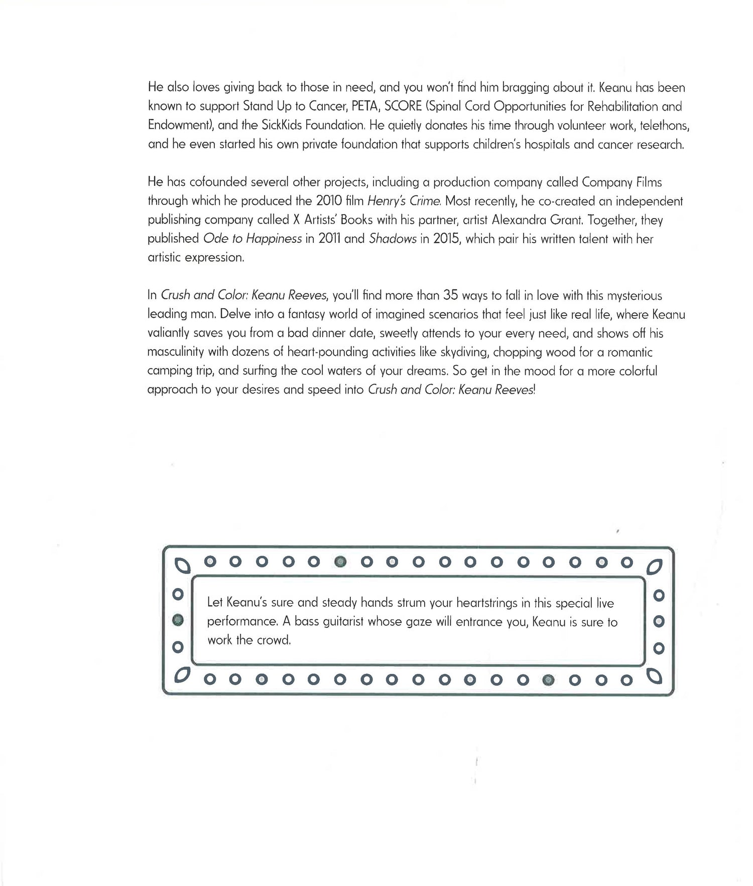 Let Keanu Reeves melt your heart. Crush and Color: Keanu Reeves is the fantasy coloring book you have been waiting for. Inside you will find a collection of daydreams and alluring scenarios with Hollywood's brooding sweetheart. Let your imagination run wild with the mystery, benevolence, and quiet magnetism of Keanu in more than 35 completely unique, lifelike drawings. Admire him as he revs his engine on a winding coastline, immerse yourself in his dreamy gaze across a dinner table, and get swept up in his good-natured endeavors. But don't rush in too soon; get to know Keanu and his impressive career with a complete introductory biography, and then you will be ready to color your very own creative utopia of fantasies.