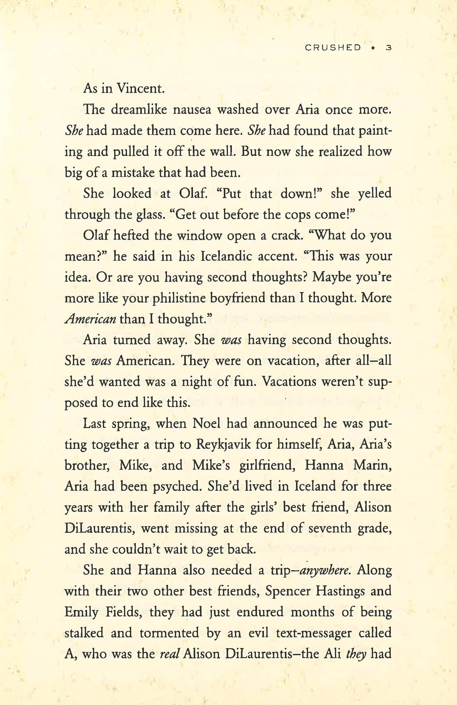 #1 New York Times bestselling series*This Book May Have Remainder Mark* The thirteenth book in the #1 New York Times bestselling series that inspired the hit ABC Family TV show Pretty Little Liars. High school seniors Aria, Emily, Hanna, and Spencer have been tortured by A for too long. Now they're determined to take the fight to A . . . even if it's the last thing they do. As the rest of Rosewood prepares for the prom, the girls drop everything in their hunt for A. But with each new piece of evidence, A only seems farther away. No matter how close the liars get, A is always one step ahead--and ready to crush them completely. Full of unexpected twists and shocking revelations, Crushed is the thirteenth book in New York Times bestselling author Sara Shepard's compelling Pretty Little Liars series. show more