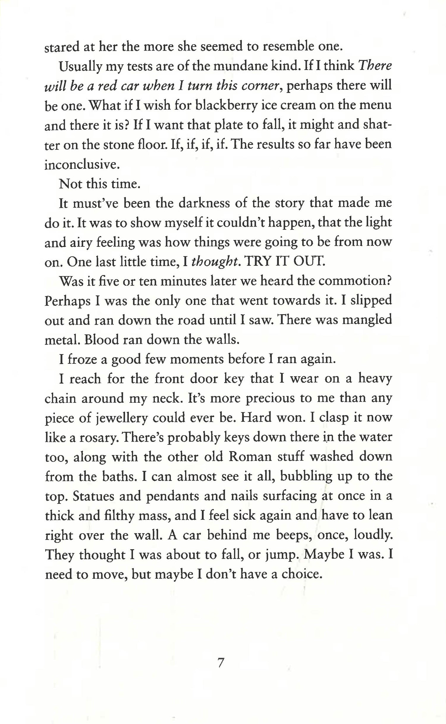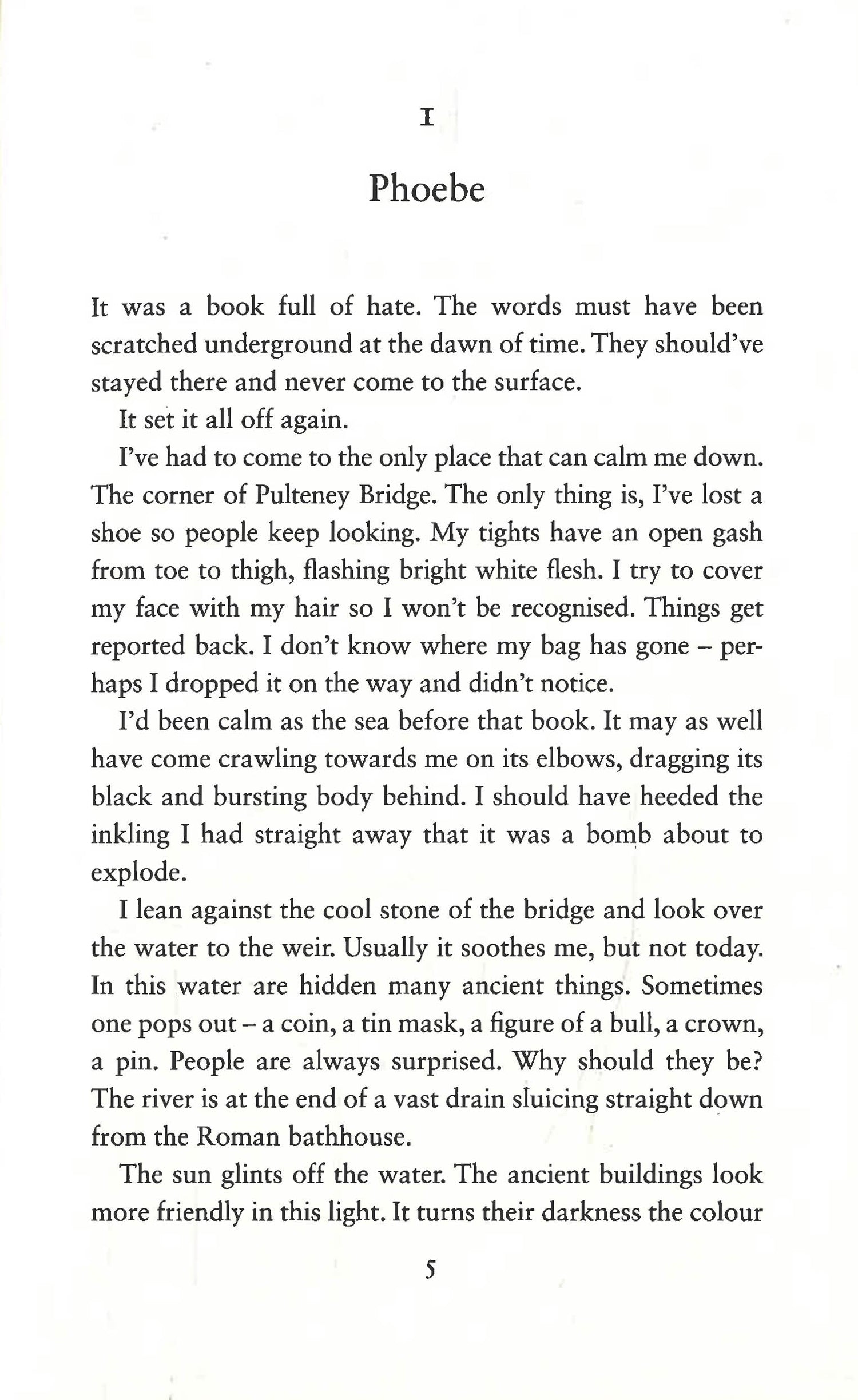 Phoebe stands on Pulteney Bridge, tights gashed from toe to thigh. The shock of mangled metal and blood-stained walls flashes through her mind as she tries to cover her face so she won't be recognised. It wouldn't do to be spotted looking like this. She's missing a shoe. She feels sick.