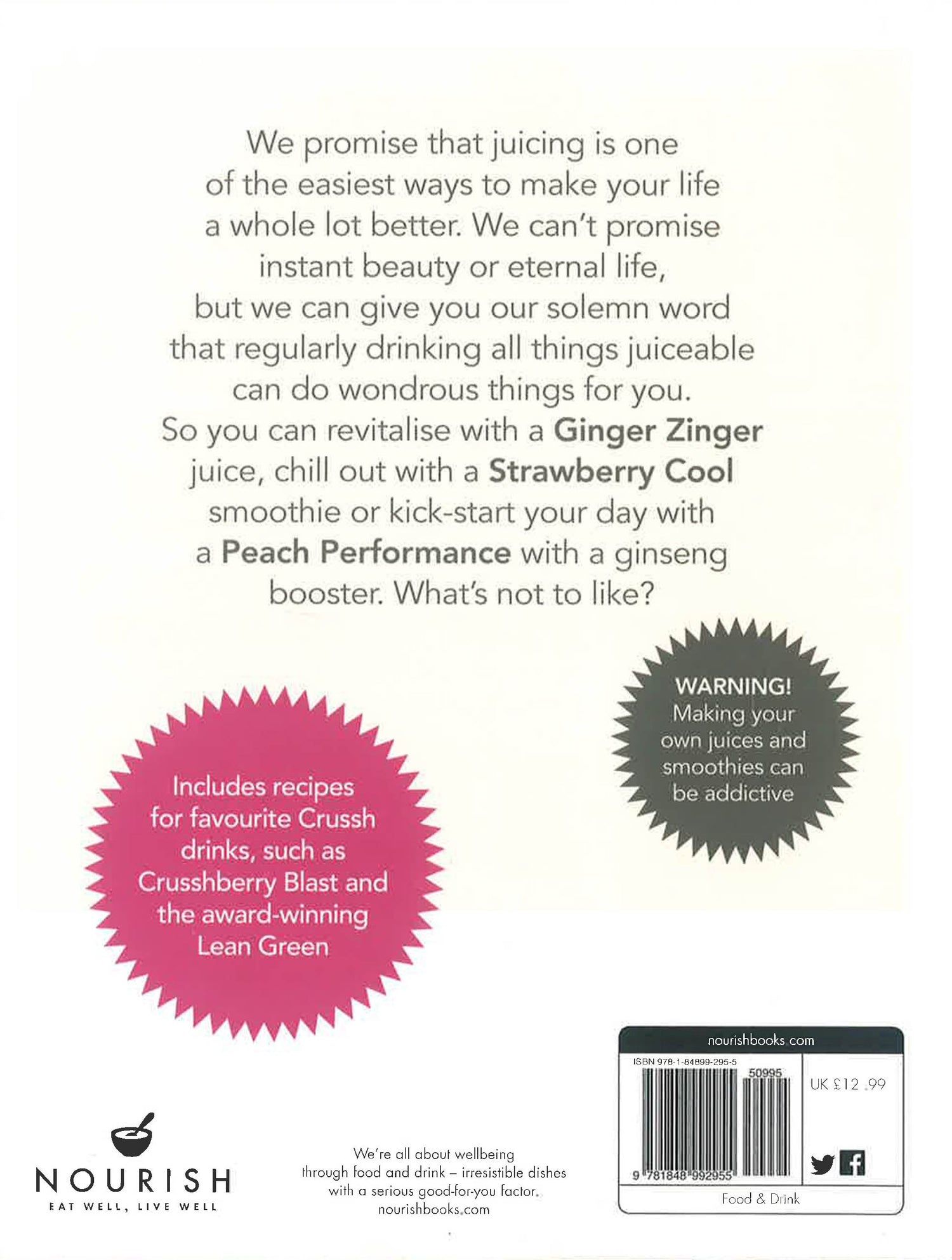 WARNING! Making your own juice and smoothies can be addictive.We promise that juicing is one of the easiest ways to make your life a whole lot better. We can't promise instant beauty or eternal life, but we can give you our solemn word that regularly drinking all things juiceable can do wondrous things for you. So you can revitalise with a Ginger Zinger juice, chill out with a Strawberry Cool smoothie or kick-start your day with a Peach Performance with a ginseng booster. What's not to like?Passionate about health, the Crussh chain avoids additives, preservations, GM foods, salt and sugar, and use the best natural and organic ingredients whenever possible. They have worked hard to perfect their recipes and now, for the first time, they are ready to share them. You'll find recipes for many of the drinks you can buy in Crussh juice bars, such as the award-winning Lean Green, Green Goddess and Crushberry Blast, as well as a whole range of newly developed drinks, including Kickstart Super Smoothie and Energy Explosion. Try these delicious recipes and discover an easy way to achieve a total health makeover.