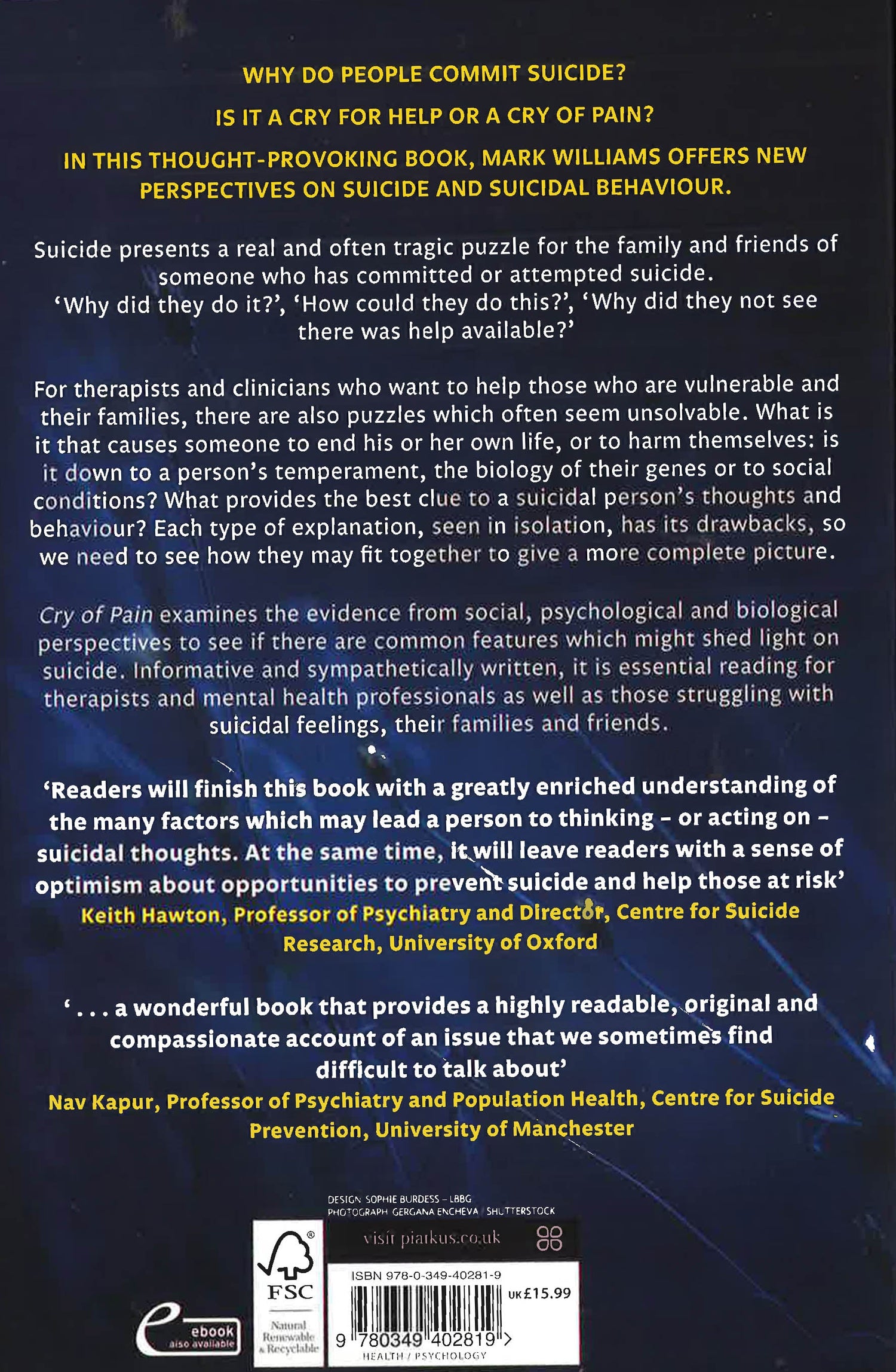 Cry of Pain examines the evidence from a social, psychological and biological perspective to see if there are common features that might shed light on suicide. Informative and sympathetically written, it is essential reading for therapists and mental health professionals as well as those struggling with suicidal feelings, their families and friends.