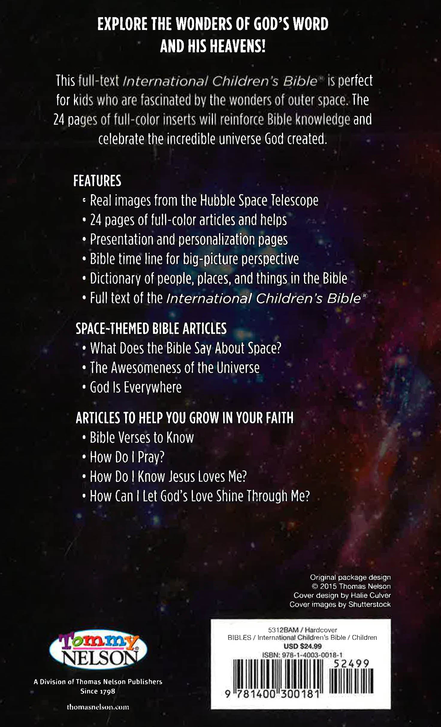 Explore the Wonders of God’s Word and His Heavens! This full-text International Children’s Bible is perfect for kids who are fascinated by the wonders of outer space. The 24 pages of full-color inserts will reinforce Bible knowledge and celebrate the incredible universe God created. Features include: Real images from the Hubble Space Telescope; 24 pages of full-color articles and helps; Presentation and personalization pages; Bible time line for big-picture perspective; Dictionary of people, places, and things in the Bible; Space-Themed Bible articles; and tips to help kids grow in their faith.