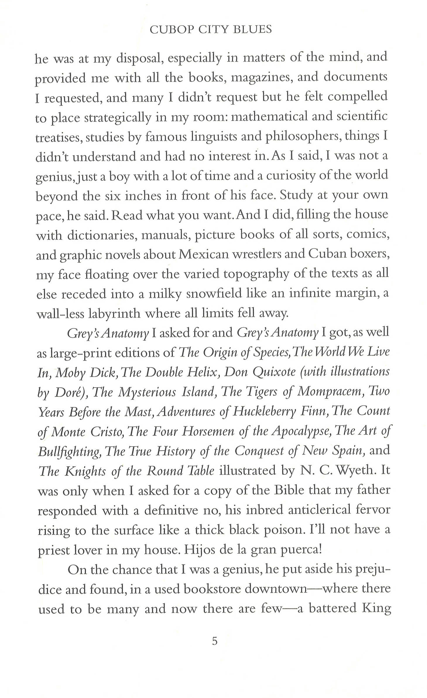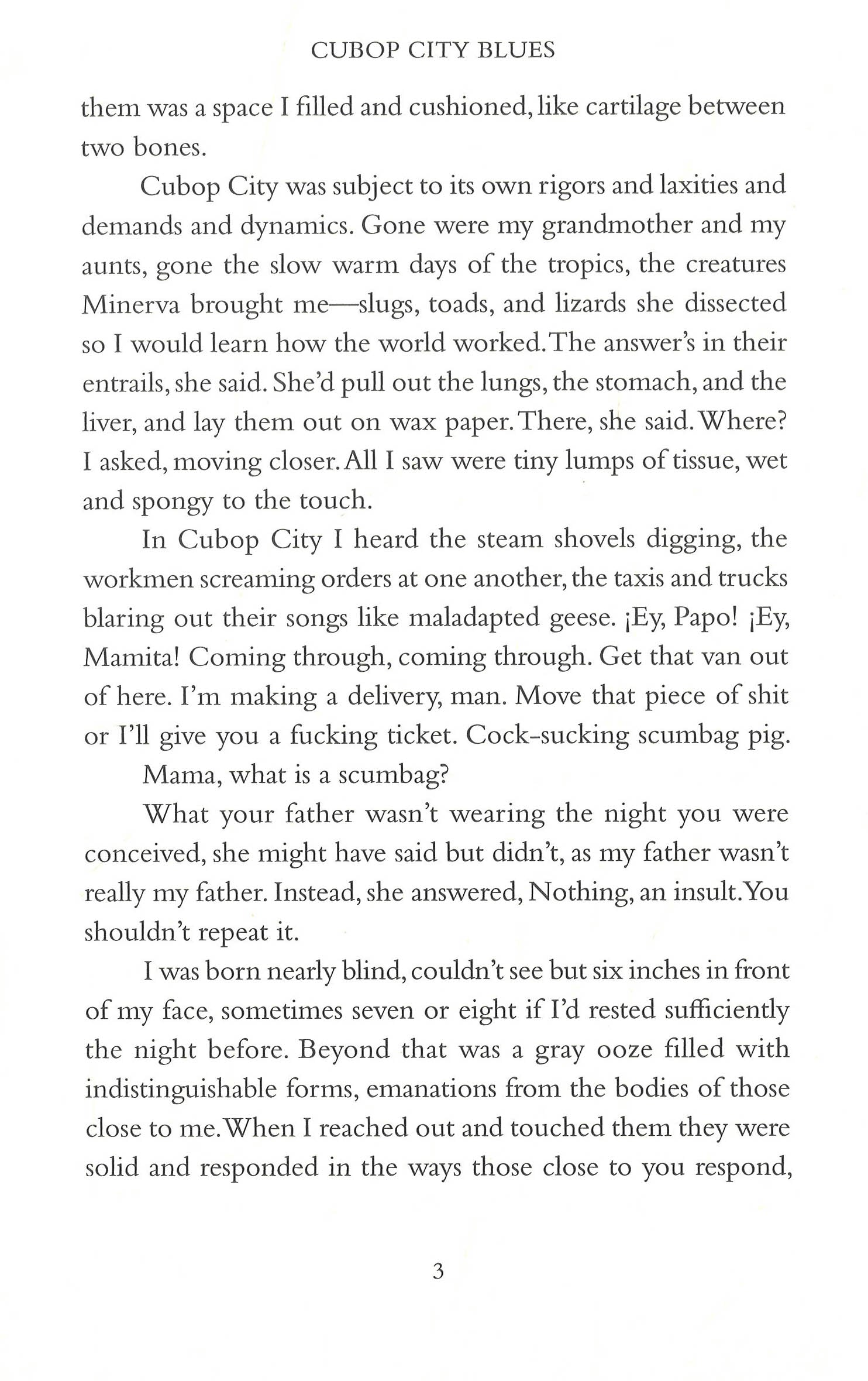Our guide into Cubop City is The Storyteller, born nearly blind and shrouded in his mother’s guilt. He’s homeschooled inside his parents’ crumbling apartment with a European housekeeper, and educated through Encyclopedia Britannica,The Bible, and Arabian Nights. When he's twenty-five, his mother and father are diagnosed with cancer, and The Storyteller is left to care for them. He does so by telling them stories conceived from the prolific reading that allowed his imagination to flourish despite little contact with the outside world.