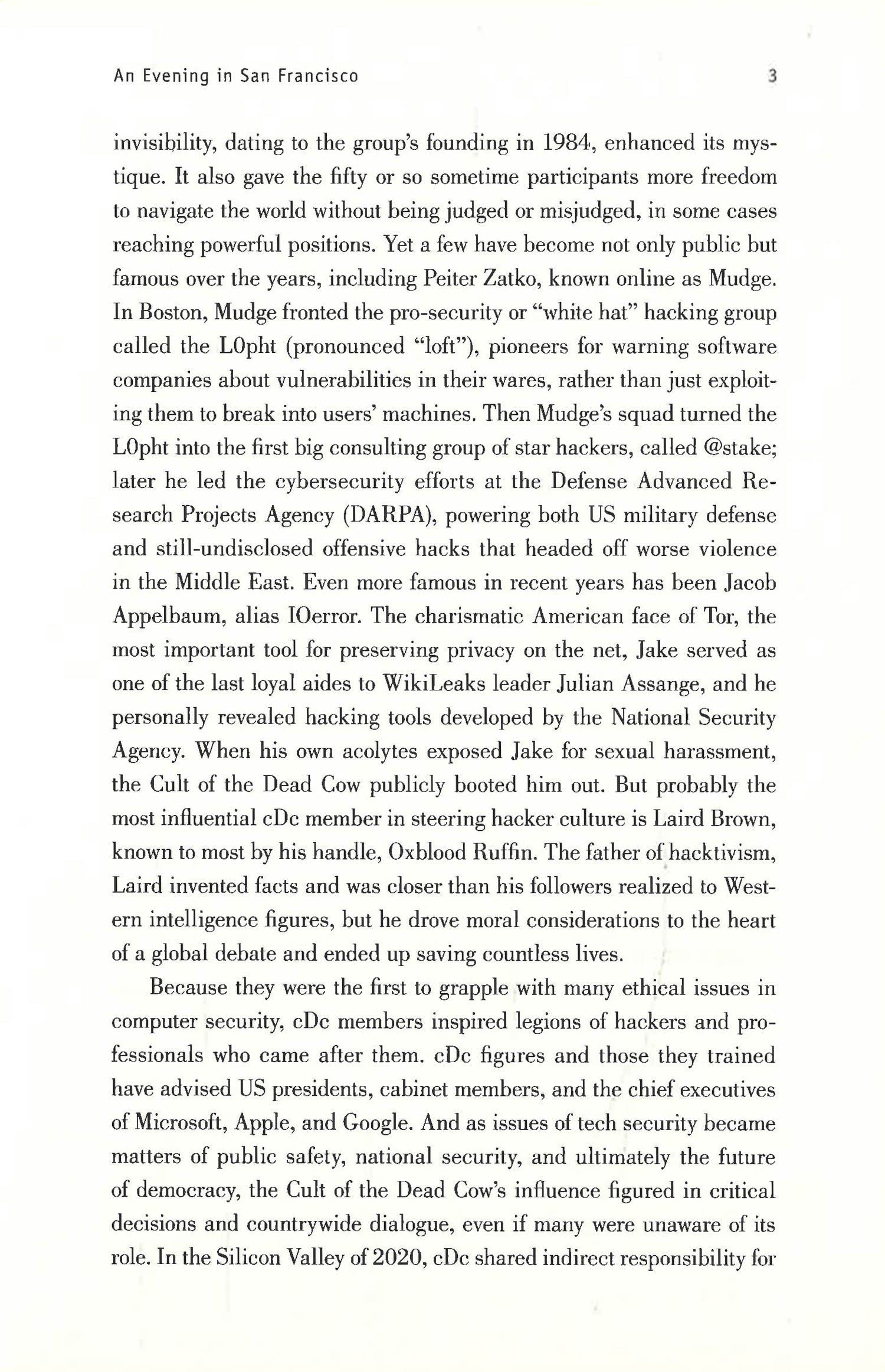 Cult of the Dead Cow is the tale of the oldest, most respected, and most famous American hacking group of all time. Though until now it has remained mostly anonymous, its members invented the concept of hacktivism, released the top tool for testing password security, and created what was for years the best technique for controlling computers from afar, forcing giant companies to work harder to protect customers. They contributed to the development of Tor, the most important privacy tool on the net, and helped build cyberweapons that advanced US security without injuring anyone. With its origins in the earliest days of the Internet, the cDc is full of oddball characters -- activists, artists, even future politicians. Many of these hackers have become top executives and advisors walking the corridors of power in Washington and Silicon Valley. The most famous is former Texas Congressman and current presidential candidate Beto O'Rourke, whose time in the cDc set him up to found a tech business, launch an alternative publication in El Paso, and make long-shot bets on unconventional campaigns.