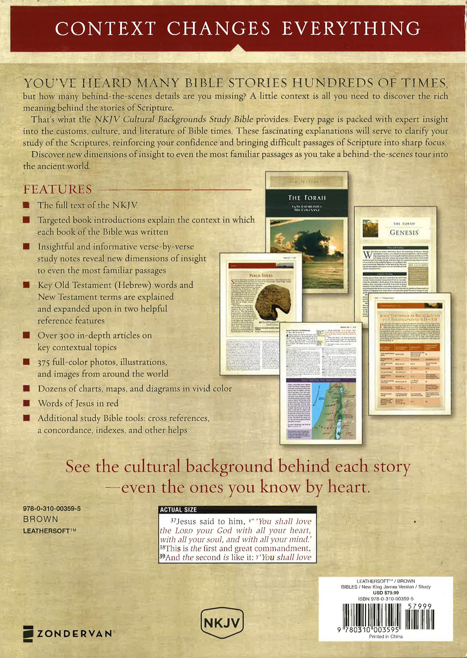 You’ve heard many Bible stories hundreds of times, but how many behind-the-scenes details are you missing? Sometimes a little context is all you need to discover the rich meaning behind the stories of Scripture.That’s what the NKJV Cultural Backgrounds Study Bible provides. Every page is packed with expert insight into the customs, culture, and literature of Bible times. These fascinating explanations will serve to clarify your study of the Scriptures, reinforcing your confidence and bringing difficult passages of Scripture into sharp focus.Discover new dimensions of insight to even the most familiar Bible passages as you take a behind-the-scenes tour into the ancient world.The Bible was originally written to an ancient people removed from us by thousands of years and thousands of miles. The Scriptures include subtle culturally based nuances, undertones, and references to ancient events, literature and customs that were intuitively understood by those who first heard the Scriptures read. For us to hear the Scriptures as they did, we need a window into their world.The NKJV Cultural Backgrounds Study Bible, with notes from Dr. John H. Walton (Wheaton College) in the Old Testament and Dr. Craig S. Keener (Asbury Theological Seminary) in the New Testament, brings to life the ancient world of Scripture for modern readers. Features• The full text of the New King James Bible (NKJV)• Targeted book introductions explain the context in which each book of the Bible was written• Insightful and informative verse-by-verse study notes reveal new dimensions of insight to even the most familiar passages• Key Old Testament (Hebrew) and New Testament terms are explained and expanded upon in two helpful reference features• Over 300 in-depth articles on key contextual topics• 375 full-color photos, illustrations, and images from around the world• Dozens of charts, maps, and diagrams in vivid color• Words of Jesus in red• Cross references• Concordance• Ribbon marker• 8.9-point text size• 9.50" x 6.50"