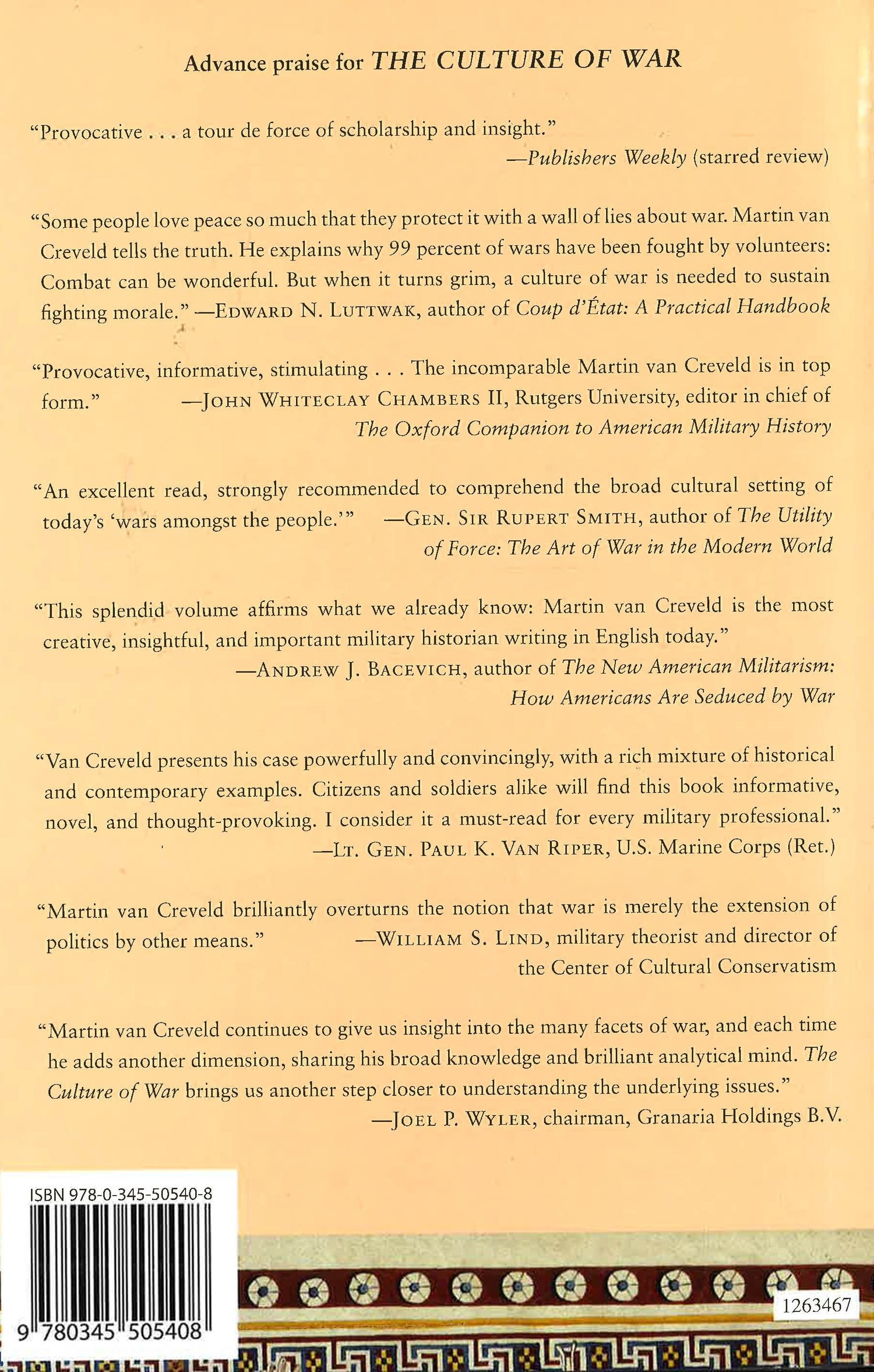 This volume, the first of its kind in any language, provides a comprehensive account of the subject. It takes aim both at leftists who denounce the culture of war as"militarist" and at "hard headed" strategists who see it as useless; arguing that the culture of war, far from being passe, is as alive today as it has ever been. Conversely, a society which, for one reason or another, loses touch with this culture will be helpless in front of one that has retained it and relishes in it.