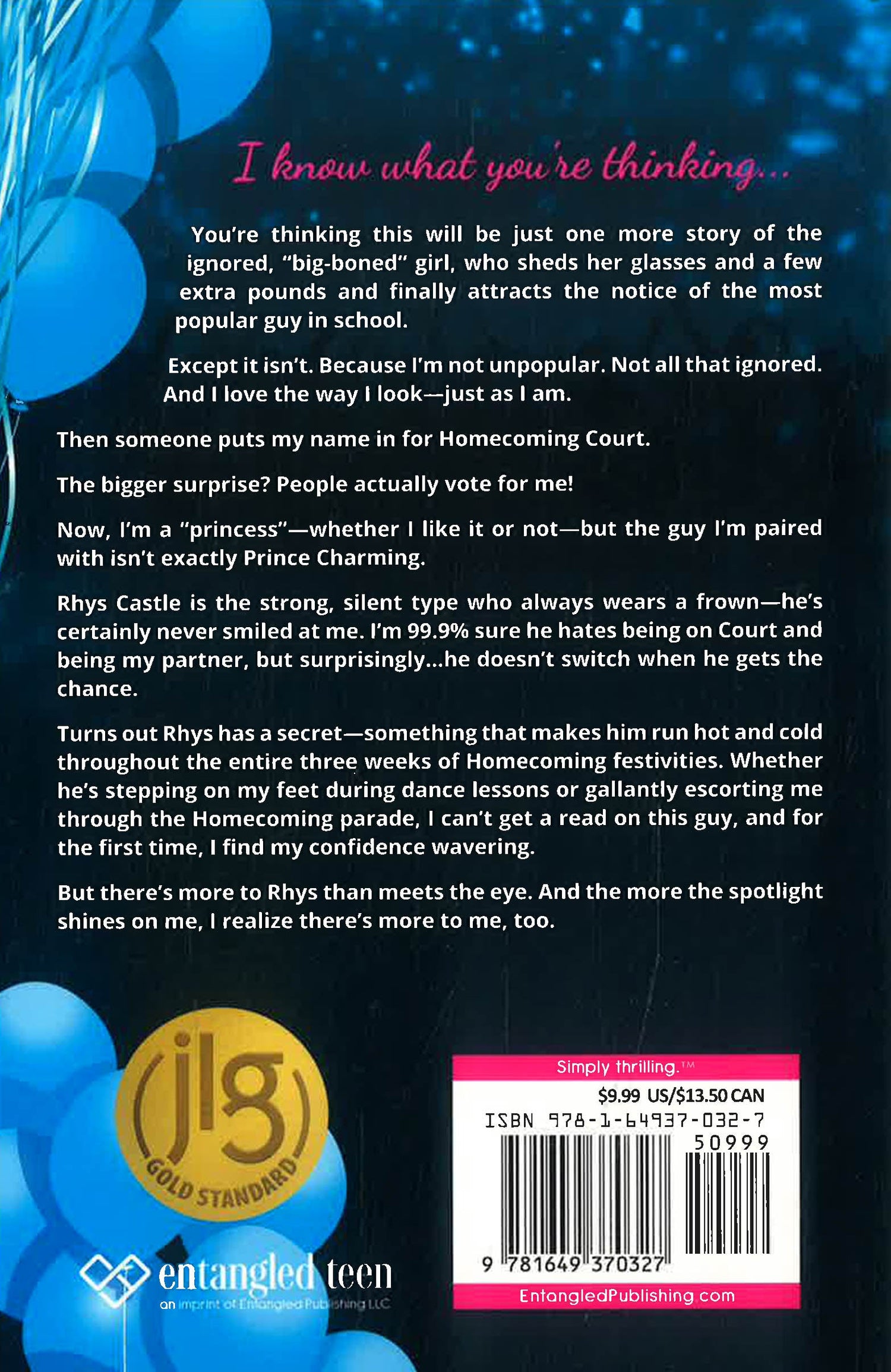 I know what you're thinking. You're thinking this will be just one more story of the ignored, "big-boned " girl, who sheds her glasses and a few extra pounds and finally attracts the notice of the most popular guy in school. Except it isn't. Because I'm not unpopular. Not all that ignored. And I love the way I look-just as I am. Then someone puts my name in for Homecoming Court. The bigger surprise? People actually vote for me! Now, I'm a "princess"-whether I like it or not-but the guy I'm paired with isn't exactly Prince Charming. Rhys Castle is the strong, silent type who always wears a frown-he's certainly never smiled at me. I'm 99.9% sure he hates being on Court and being my partner, but surprisingly.he doesn't switch when he gets the chance. Turns out Rhys has a secret-something that makes him run hot and cold throughout the entire three weeks of Homecoming festivities. Whether he's stepping on my feet during dance lessons or gallantly escorting me through the Homecoming parade, I can't get a read on this guy, and for the first time, I find my confidence wavering. But there's more to Rhys than meets the eye. And the more the spotlight shines on me, I realize there's more to me, too.