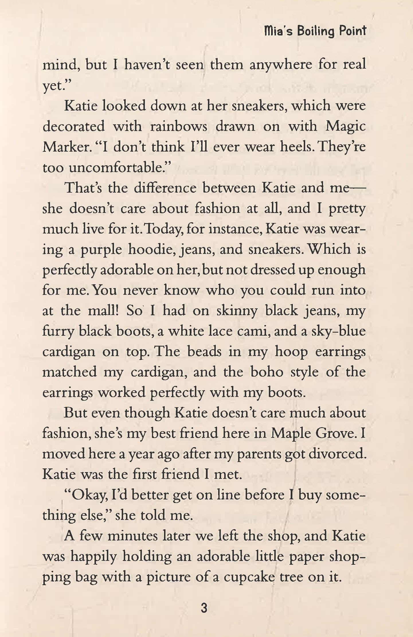 When Katie first started middle school, she was a little nervous - and having her best friend dump her to join the Popular Girls Club didn't help. Luckily, Katie met a great group of new friends and together they formed the Cupcake Club. Katie soon discovered that sometimes starting from scratch with new friends turns out to be the icing on the cupcake! This book contains stories ten through twelve in the Cupcake Diaries series: Mia's Boiling Point; Emma, Smile and Say "Cupcake!"; Alexis Gets Frosted.