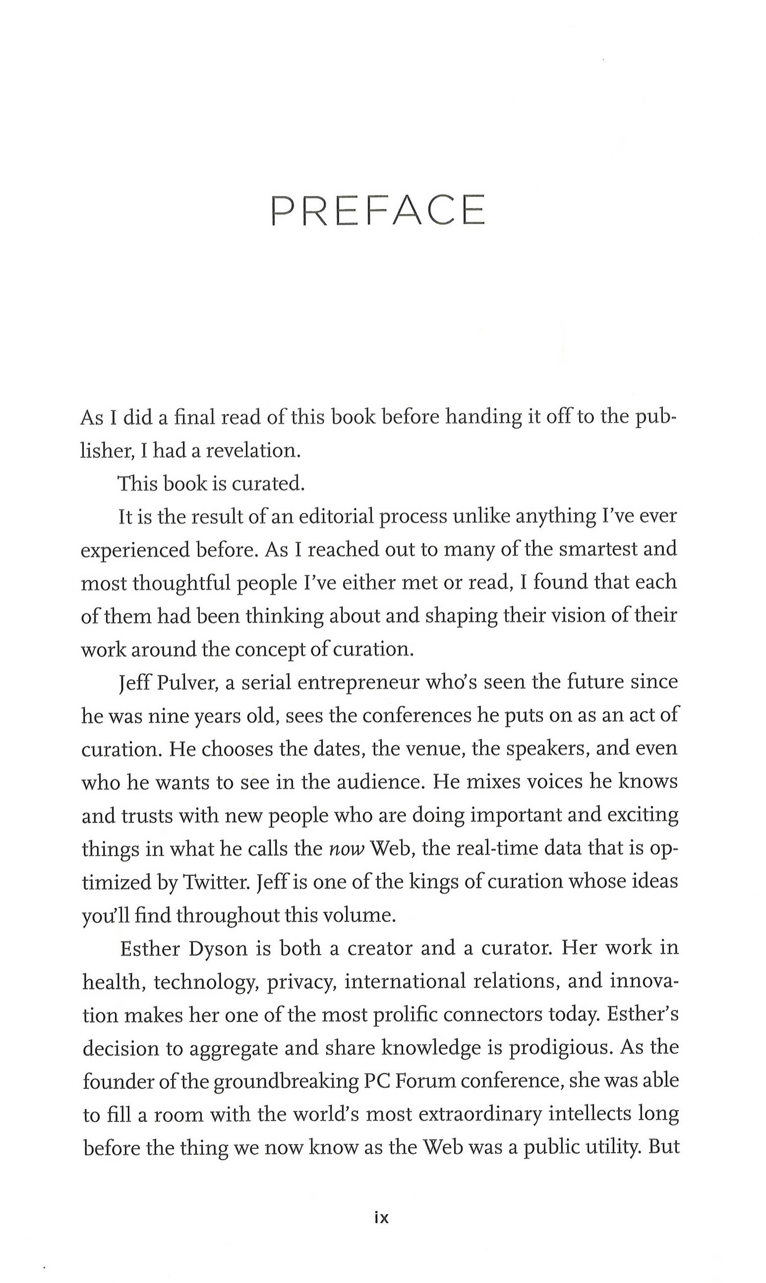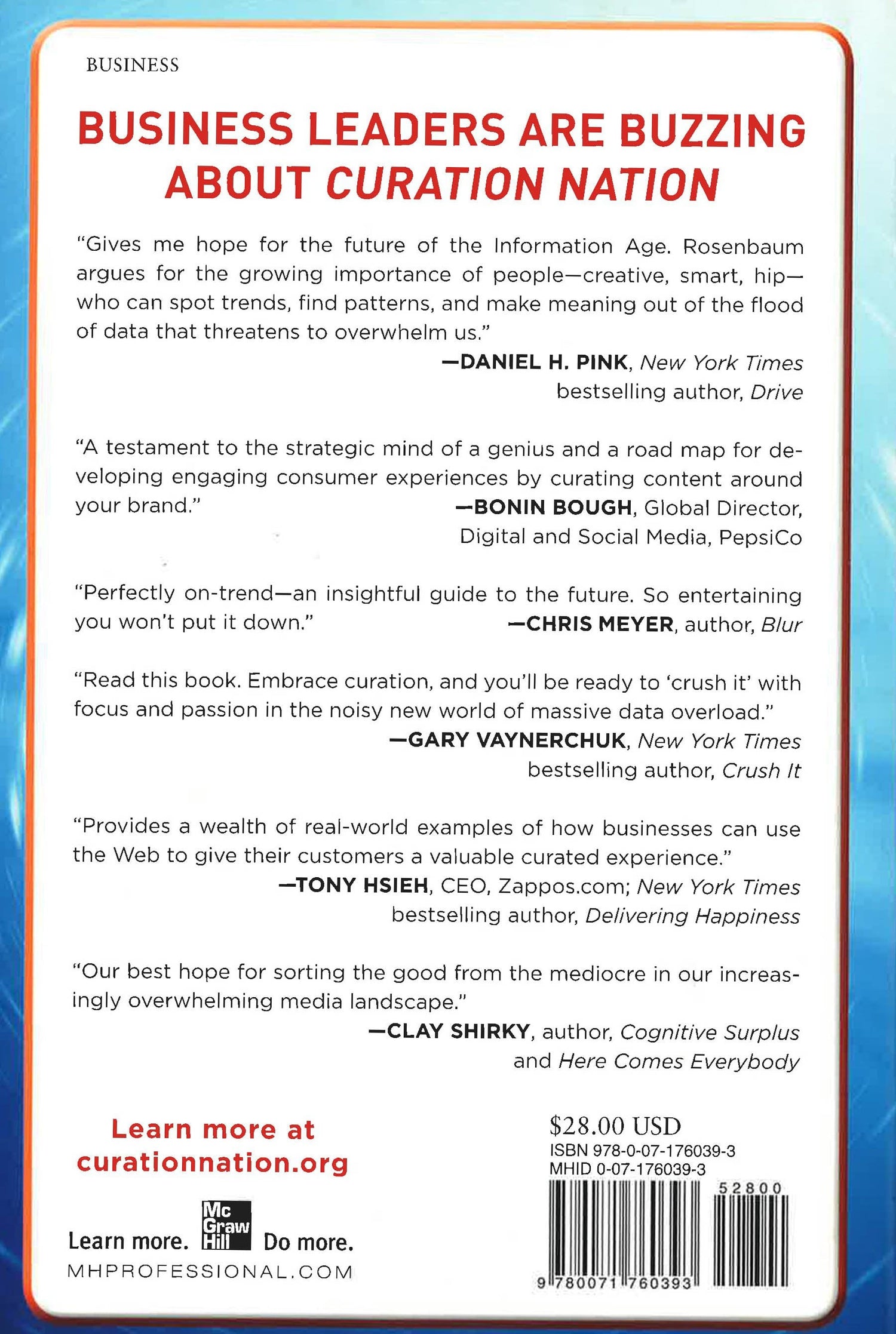 Business Leaders Are Buzzing About Curation Nation An indispensible guide to the brave new media world. -Arianna Huffington, editor in chief, the Huffington Post Gives me hope for the future of the Information Age. Rosenbaum argues for the growing importance of people-creative, smart, hip-who can spot trends, find patterns, and make meaning out of the flood of data that threatens to overwhelm us. -Daniel H. Pink, New York Timesbestselling author of Drive A testament to the strategic mind of a genius and a road map for developing engaging consumer experiences by curating content around your brand. -Bonin Bough, Global Director, Digital and Social Media, PepsiCo Perfectly on-trend-an insightful guide to the future. So entertaining you won't put it down. -Chris Meyer, author of Blur Read this book. Embrace curation, and you'll be ready to 'crush it' with focus and passion in the noisy new world of massive data overload. -Gary Vaynerchuk, New York Timesbestselling author of Crush It Provides a wealth of real-world examples of how businesses can use the Web to give their customers a valuable curated experience. -Tony Hsieh, CEO, Zappos.com, and New York Timesbestselling author of Delivering Happiness Our best hope for sorting the good from the mediocre in our increasingly overwhelming media landscape. -Clay Shirky, author of Cognitive Surplusand Here Comes Everybody About the Book: Let's face it, we're drowning in data. Our inboxes are flooded with spam, we have too many "friends" on Facebook, and our Twitter accounts have become downright unmanageable. Creating content is easy; finding what matters is hard. Fortunately, there is a new magic that makes the Web work. It's called curation, and it enables people to sort through the digital excess and find what's relevant. In Curation Nation, Steven Rosenbaum reveals why brands, publishers, and content entrepreneurs must embrace aggregation and curation to grow an existing business or launch a new one. In fact, he asserts that curation is the only way to be competitive in the future. Overwhelmed by too much content, people are hungry for an experience that both takes advantage of the Web's breadth and depth and provides a measure of human sorting and filtering that search engines simply can't achieve. In these shifting sands lies an extraordinary business opportunity: you can become a trusted source of value in an otherwise meaningless chaos of digital noise. In Curation Nation, Rosenbaum "curates the curators" by gathering together priceless insight and advice from the top thinkers in media, advertising, publishing, commerce, and Web technologies. This groundbreaking book levels the playing field, giving your business equal access to the content abundance presently driving consumer adoption of the Web. As the sheer volume of digital information in the world increases, the demand for quality and context becomes more urgent. Curation will soon be a part of your business and your digital world. Understand it now, join in early, and reap the many benefits Curation Nation has to offer.