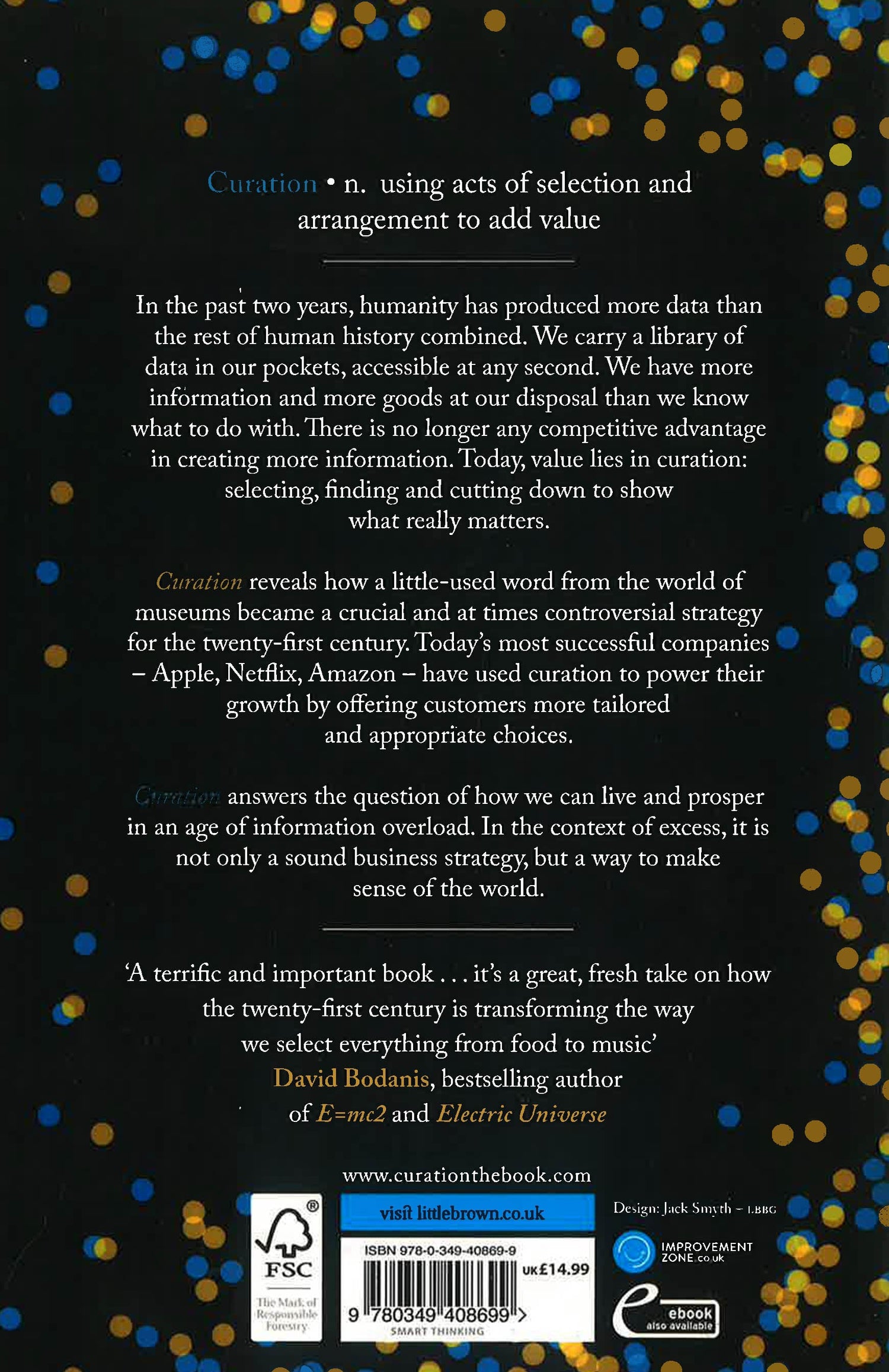 Curation, or the art of selecting useful information to form meaningful collections, is the new buzzword that tech companies and media professionals have eagerly latched on to. But curation is a far more powerful and deeply relevant idea than we give it credit for. It answers the question of how we make sense of a culture in which problems are often about having too much, and shows how we keep growing in a world of excess. Acts of selecting, refining and arranging to add value help us overcome information overload. This book highlights the numerous places in which this simple but forceful skill is increasingly felt: in art and on the Web, but also in retail and manufacturing, high finance and government policy. CURATION is an exciting and wide-ranging work of business-oriented non-fiction incorporating the latest thinking in economics, technology, business strategy, complexity theory, media and psychology with strong narratives and big ideas. Through powerful personal stories about real jobs, lives, companies and industries fighting to thrive in crowded markets, it reveals how a little-used word from the world of museums became a crucial business strategy for the 21st century. Curation is one of the most gripping and unignorable business ideas for our time, and organisations and individuals who make the most of it will position themselves to grow.