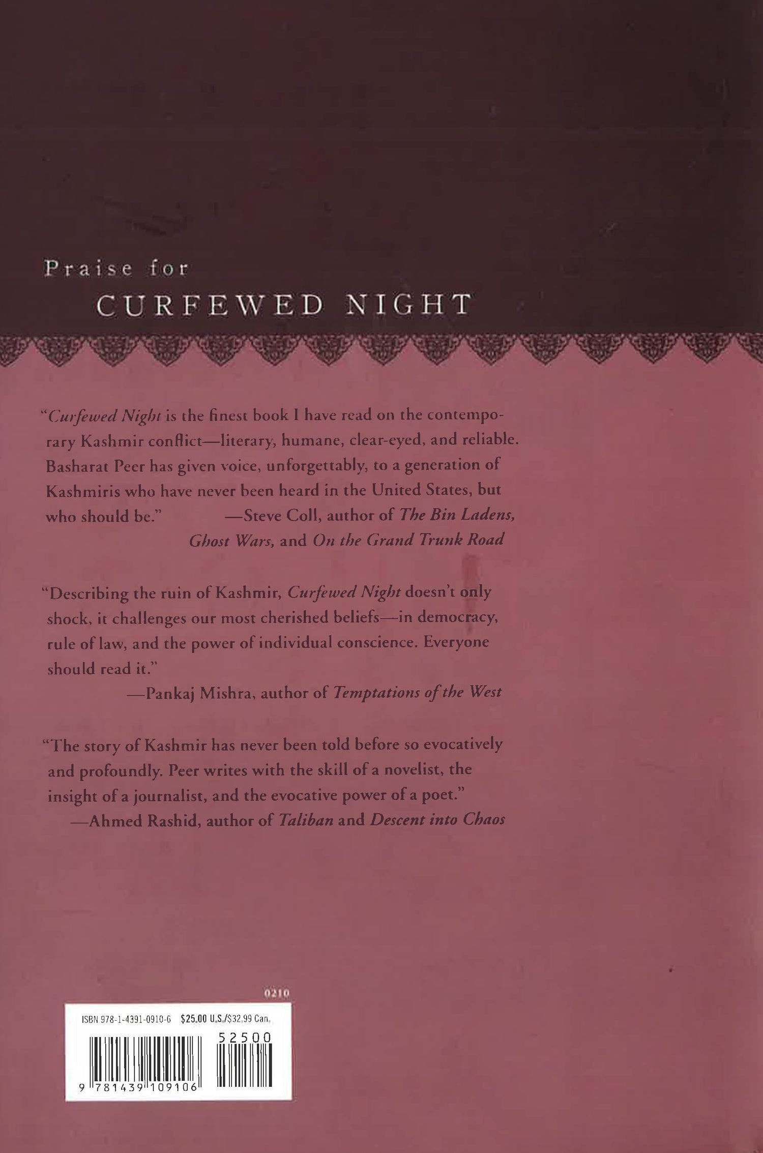Since 1989, when the separatist movement exploded in Kashmir, more than 70,000 people have been killed in the battle between India and Pakistan over Kashmir. Born and raised in the war-torn region, Basharat Peer brings this little-known part of the world to life in haunting, vivid detail.. Peer reveals stories from his youth as well as gut-wrenching accounts of the many Kashmiris he met years later, as a reporter. He chronicles a young man's initiation into a Pakistani training camp; a mother who watches as her son is forced to hold an exploding bomb; a poet who finds religion when his entire family is killed. He writes about politicians living in refurbished torture chambers, idyllic villages rigged with landmines, and ancient Sufi shrines decimated in bomb blasts.. "Curfewed Night" is a tale of a man's love for his land, the pain of leaving home, and the joy of return--as well as a fiercely brave piece of literary reporting..