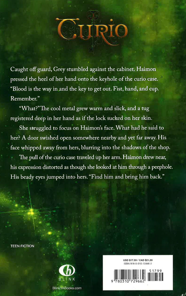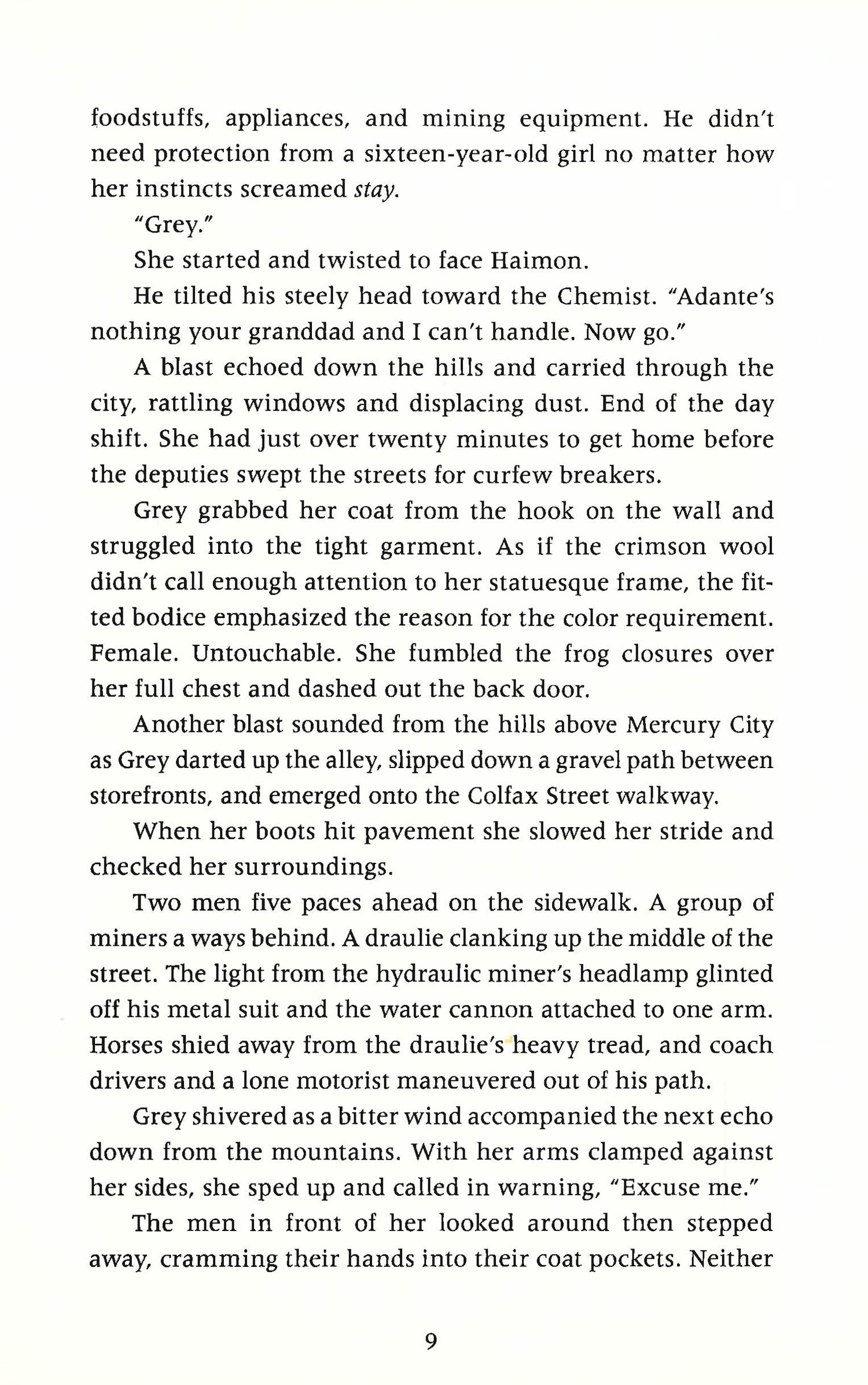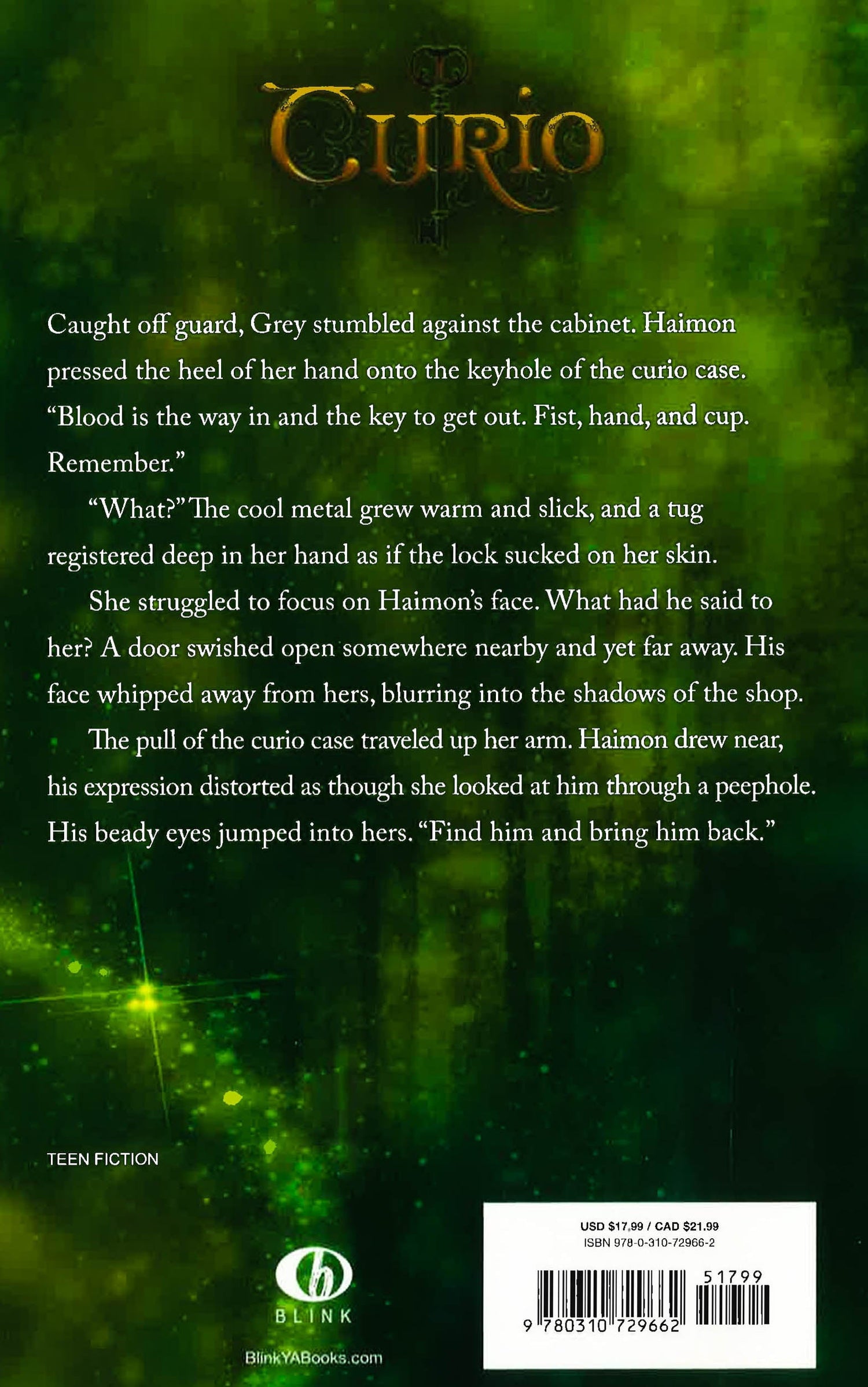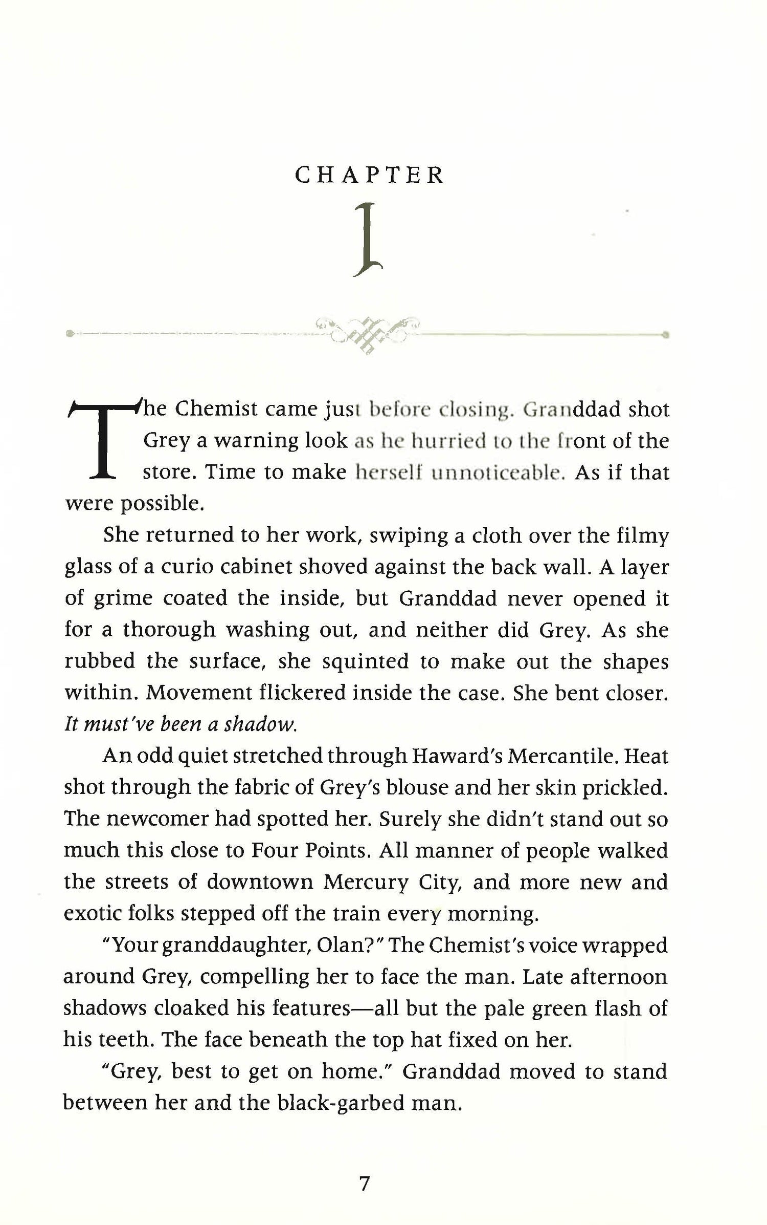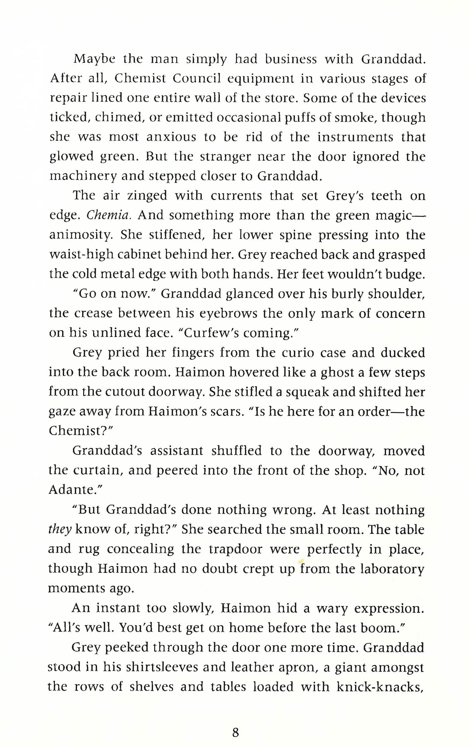 In this steampunk-flavored YA novel by Evangeline Denmark, Grey has a secret the Chemists who rule her town can never know. But when her best friend is taken for punishment, Grey risks everything---and finds herself in a world hidden within a curio cabinet, where porcelain and clockwork people are real, and her secret has far-reaching consequences.Grey Haward has always detested the Chemists, the magicians-come-scientists who rule her small western town. But she has always followed the rules, taking the potion the Chemists ration out that helps the town's people survive. A potion that Grey suspects she-like her grandfather and father-may not actually need.By working at her grandfather's repair shop, sorting the small gears and dusting the curio cabinet inside, Grey has tried to stay unnoticed-or as unnoticed as a tall, strong girl can in a town of diminutive, underdeveloped citizens. Then her best friend, Whit, is caught by the Chemists' enforcers after trying to protect Grey one night, and after seeing the extent of his punishment, suddenly taking risks seems the only decision she can make.But with the risk comes the reality that the Chemists know her family's secret, and the Chemists soon decide to use her for their own purposes. Panicked, Grey retreats to the only safe place she knows-her grandfather's shop. There, however, a larger secret confronts her when her touch unlocks the old curio cabinet in the corner and reveals a world where porcelain and clockwork people are real. There, she could find the key that may save Whit's life and also end the Chemists' dark rule forever.