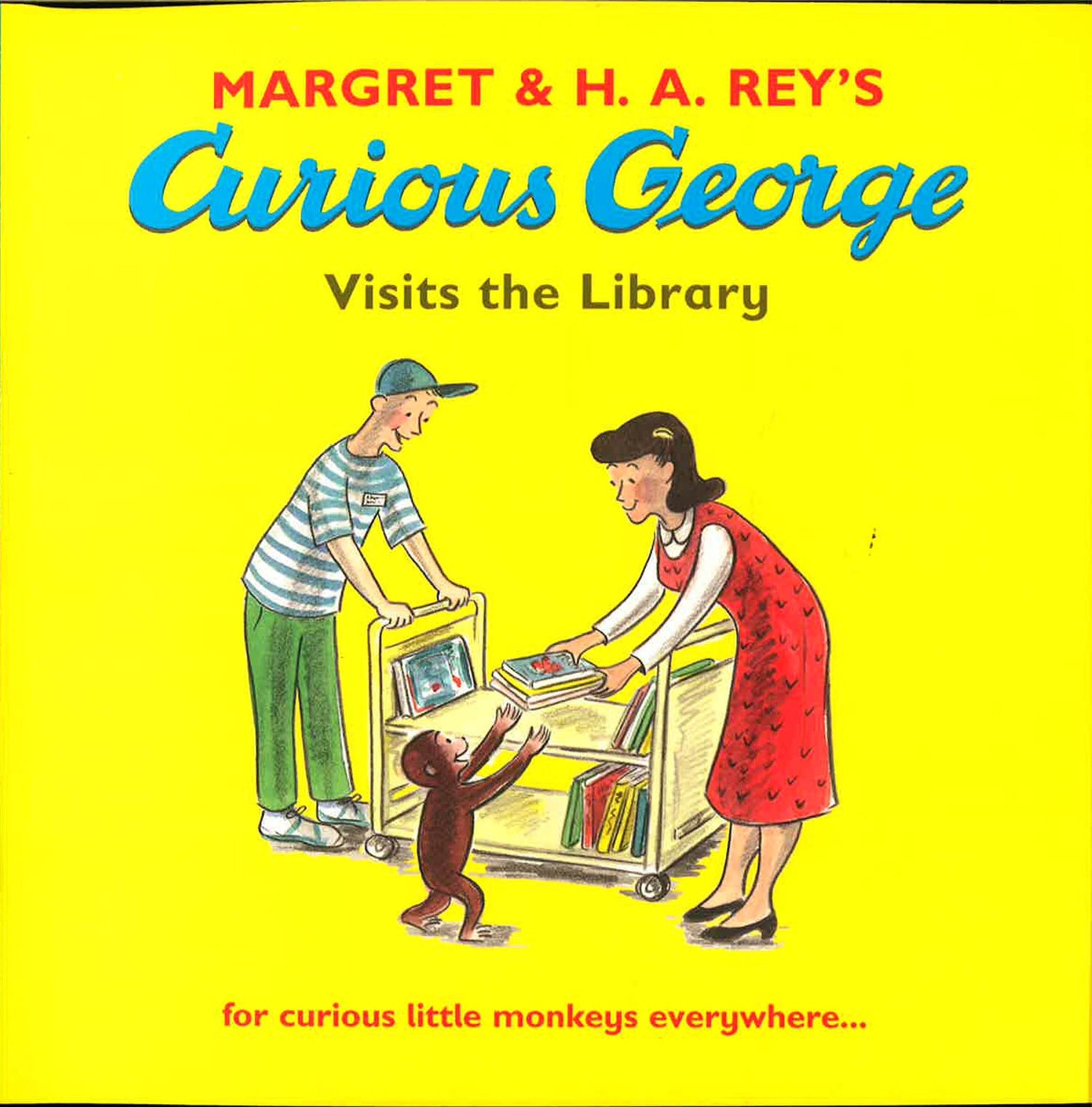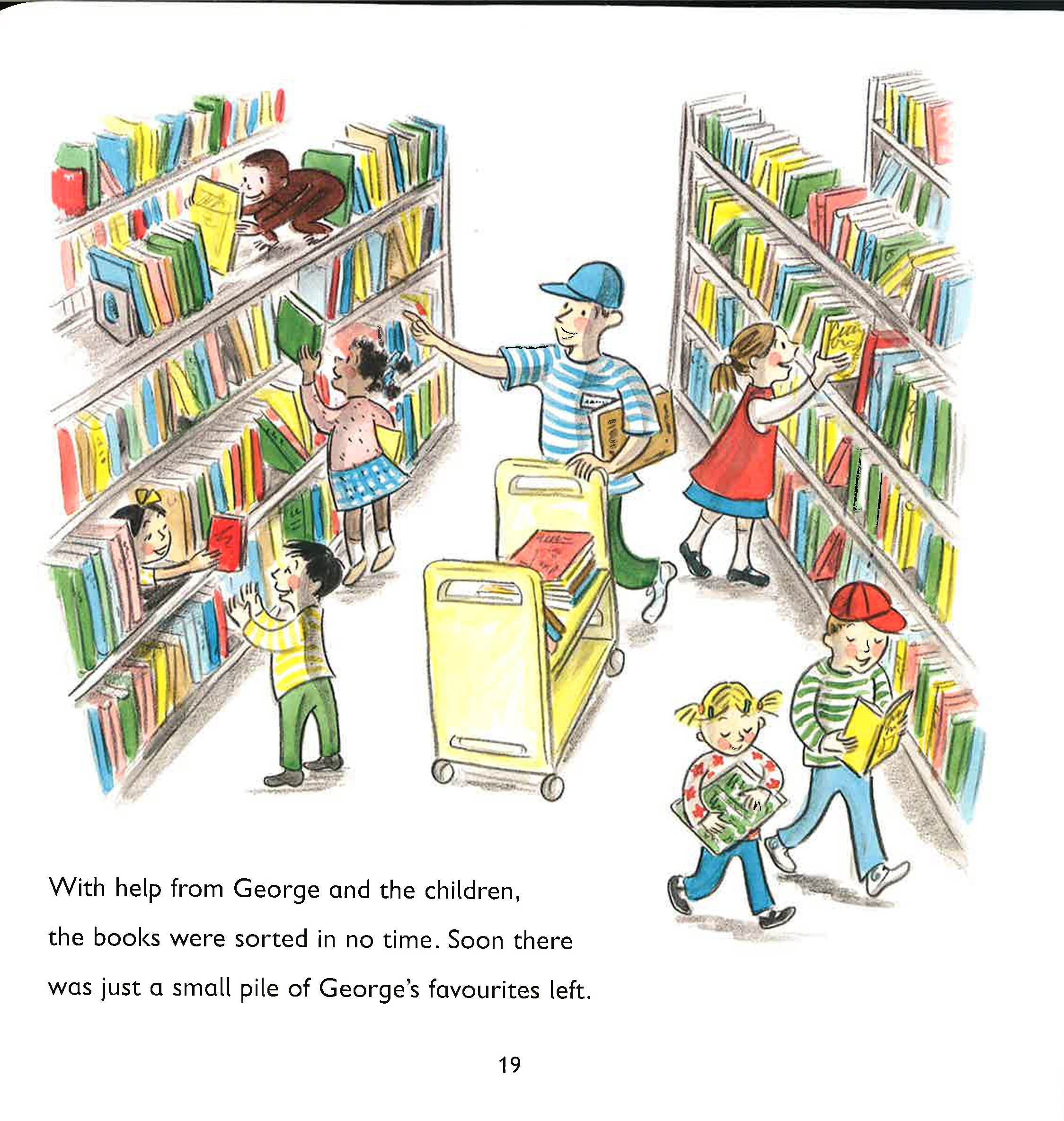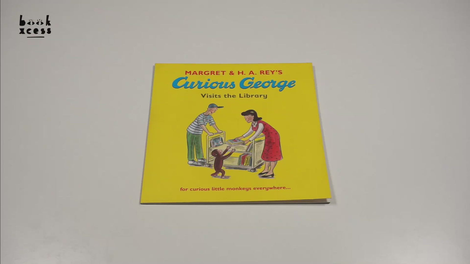 The man in the yellow hat takes George for his very first visit to the library. George can't believe how many books there are and loads up a trolley with his favourites, but the trolley picks up speed and crashes - what a mess! With the help of the librarian and the other children, the books are all picked up and sorted out, and George is left with a small pile of his favourites. He is even given a new library card so that he can borrow some more when he visits again.